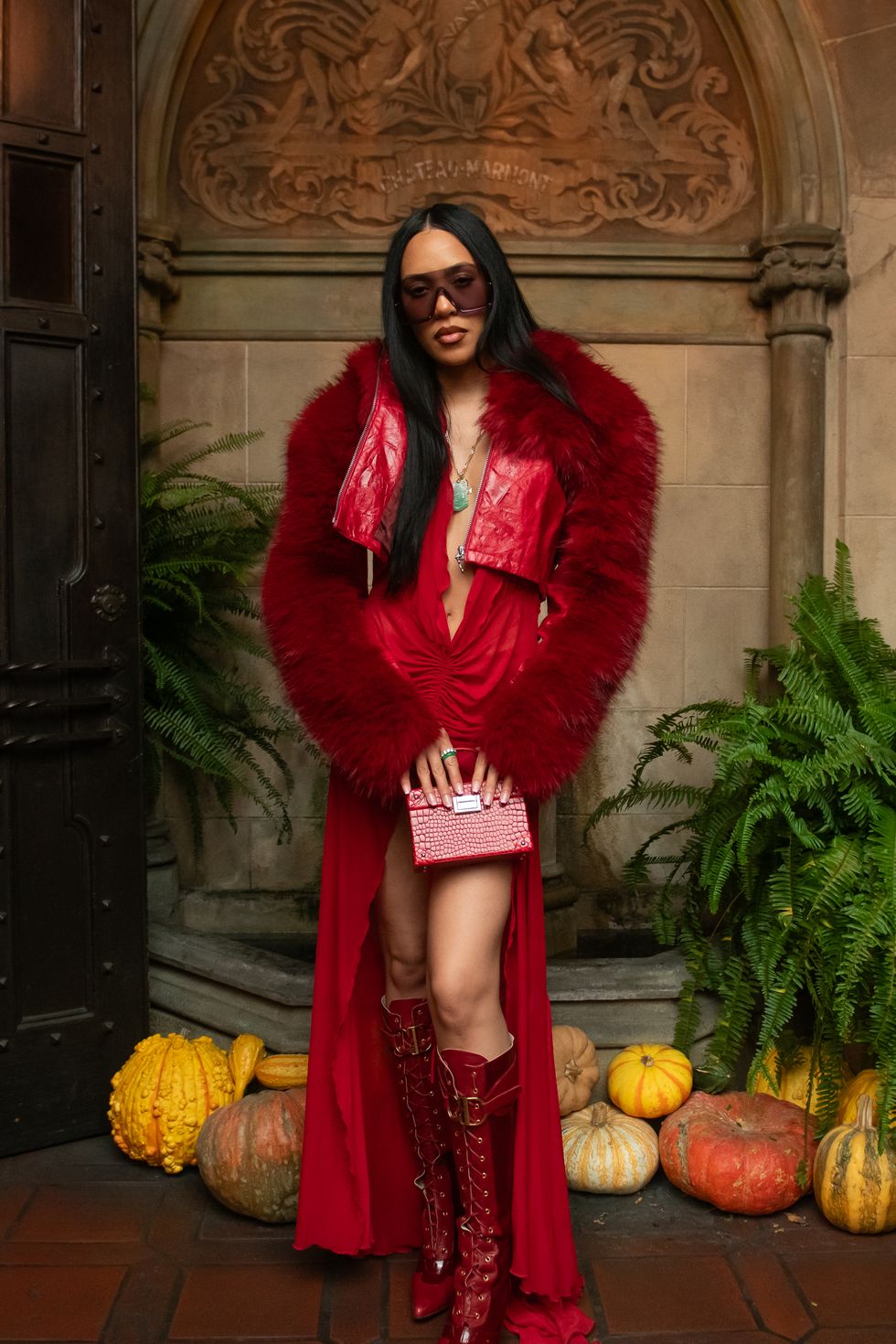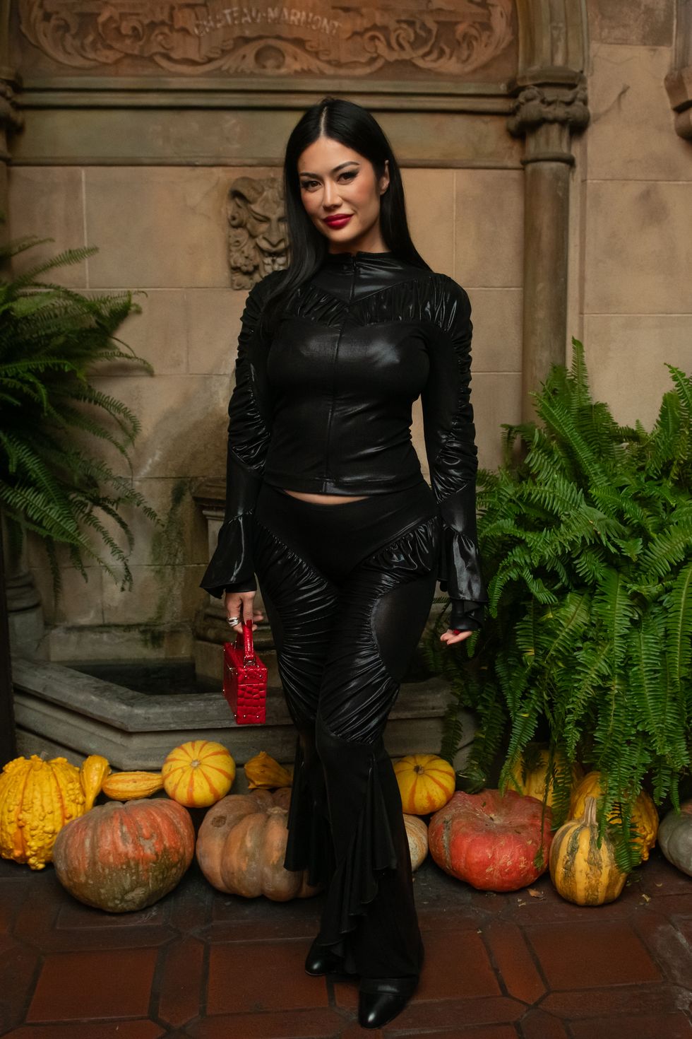 Held in the Chateau garden, Shui’s night featured a long table with black candles and floral arrangements that matched the color-scheme of her collection. Guests brought their own personal style to the looks, though. TiaCorine had bright blue hair and Siobhan Bell had cherry red. Jhene Aiko went for a more whimsical, romantic interpretation of Kim Shui, styled by Sam Woolf, and Lauren Jauregui went full sexy, styled by Lyn Alyson. Everyone sipped martinis, while sharing a special curated menu (and streaming the Jake Paul vs. Mike Tyson fight).