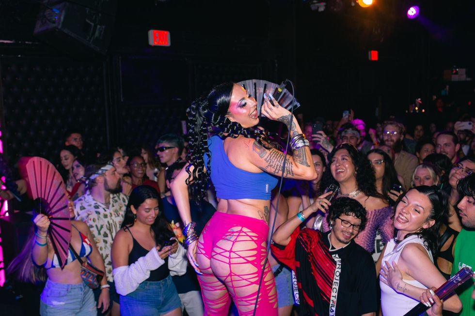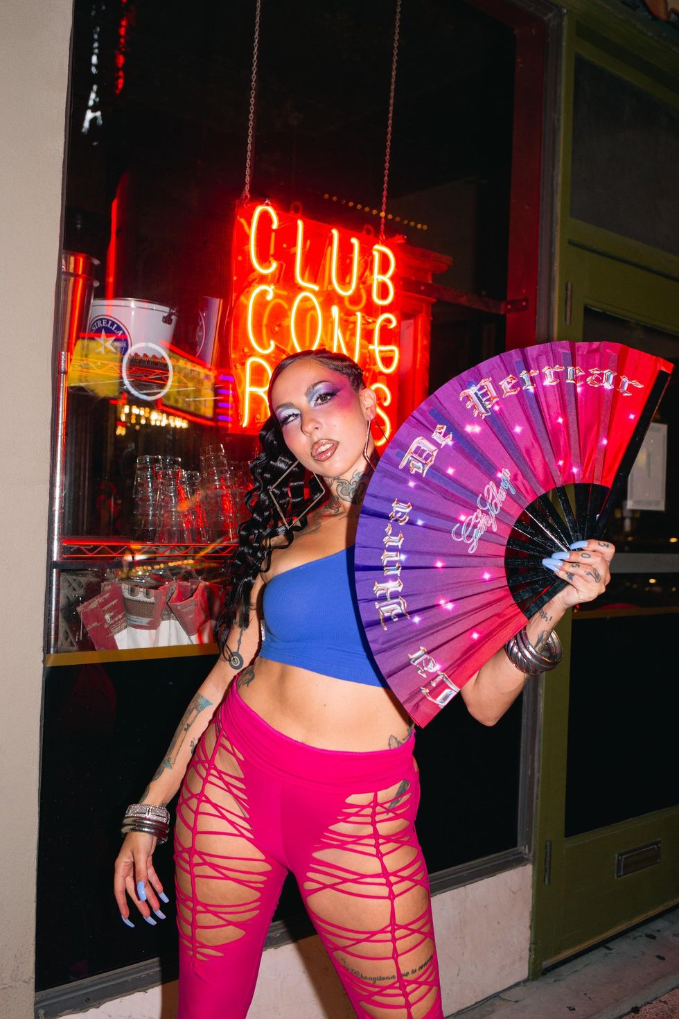 It's nearing midnight when La Goony Chonga takes the stage at Tucson’s Club Congress, much to the excitement of the army of Gooniez crowded around the stage. All of them are ecstatic, cheering as she emerges in a bright blue crop top and pair of magenta cut-out pants, ready and revved up to perform her new song, "Abanico." And given that it's currently 95 degrees outside, it feels like the perfect time for the live debut of a sensual, high-energy anthem about fanning yourself with an abanico while twerking in the heat.