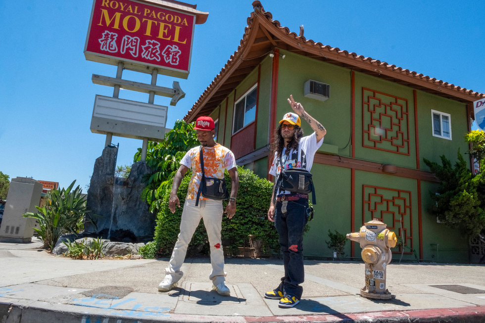 Beneath the armpit of the 110 is the Royal Pagoda Motel, a chintzy motor lodge with the kind of upturned eaves and dragon doorknockers you'd expect from LA's Chinatown. From the outside, it looks abandoned, the neon lights burnt out and the parking lot cordoned off, the lobby dark and dusty as I peer through the window. Visibly confused, my companions — Jimbo Williams and Aristotle Sanchez — begin to wonder what's going on, before a security guard walks over to inform us we can't come in. "The building's been converted into housing for the homeless," he says with a grumpy frown as Williams and Sanchez ask if their friend still works there. And while they continue to protest in the background, all I can think about is how strange this synchronicity is — how odd that things have circled back to this point and how ironic that this also used to be their home.