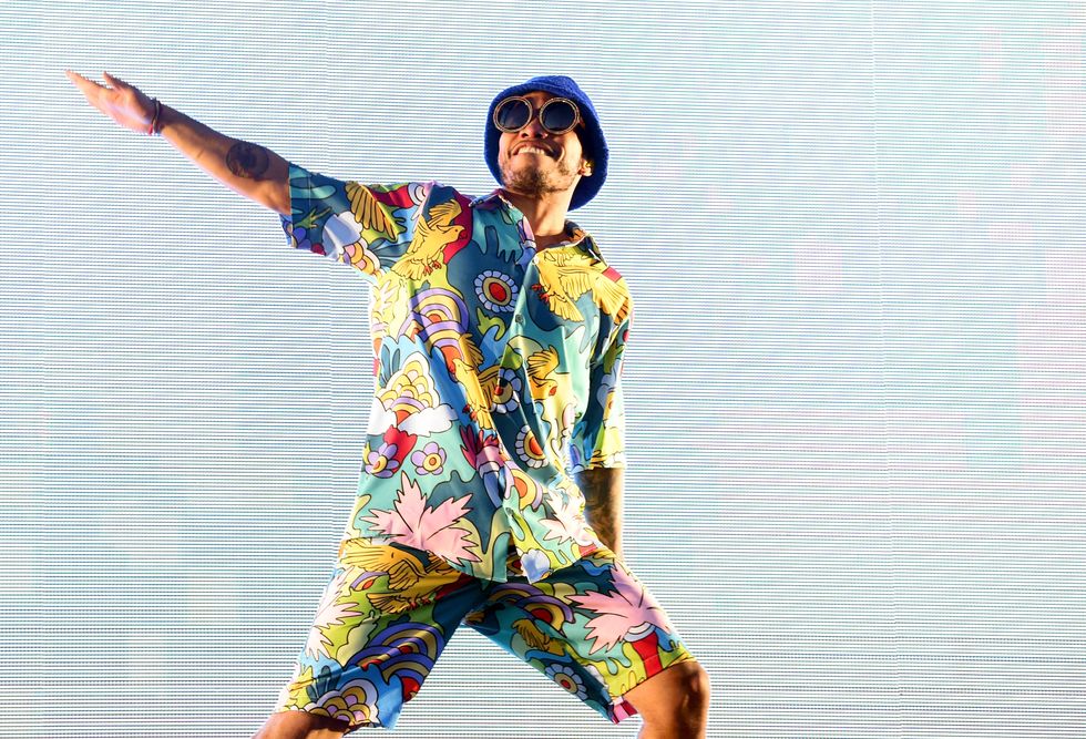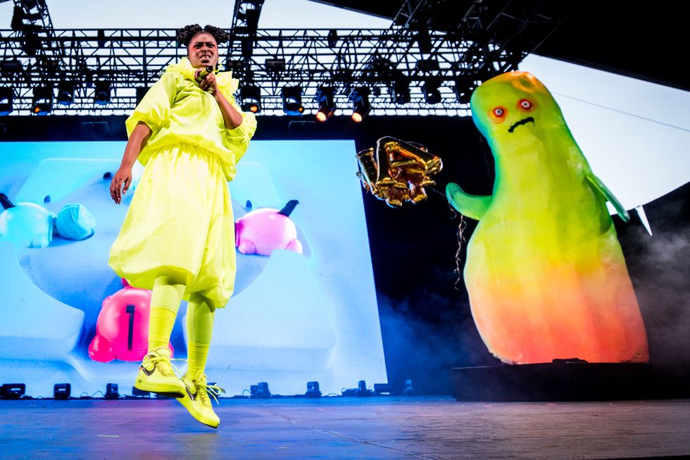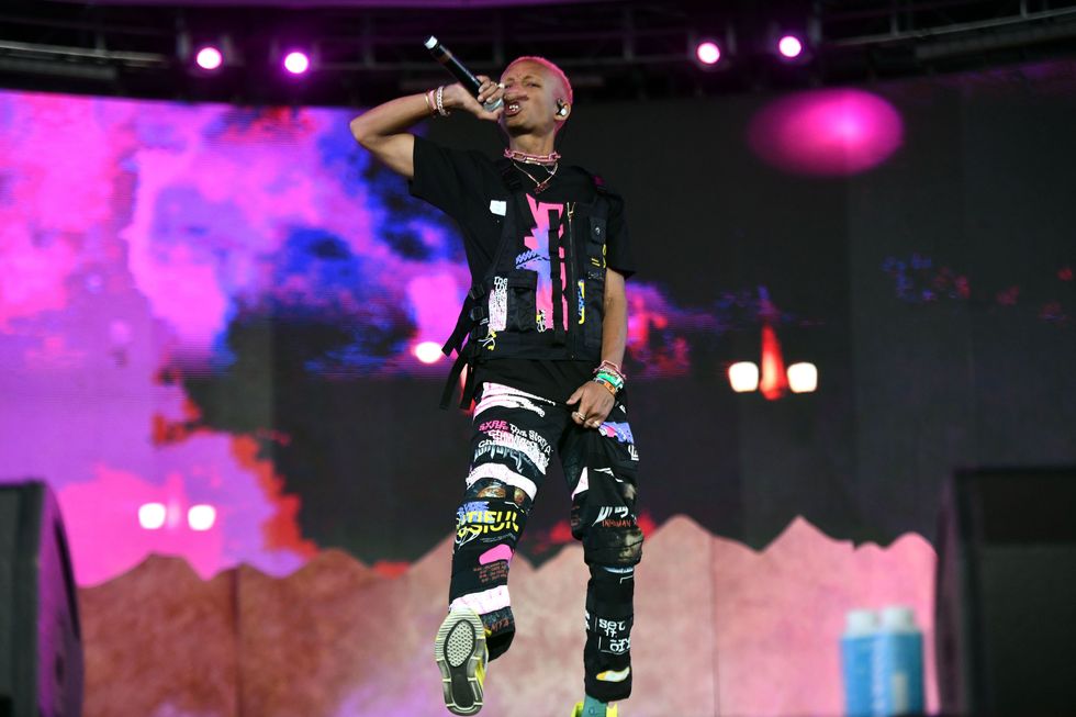 LA Roxx was behind rapper Tierra Whack's inflatable highlighter yellow dress, which blew up mid-performance like Violet Beauregard. This was easily Coachella's strangest look, and one that continued strongly in the vein of Whack World. The brand also outfitted Jaden Smith, who danced on top of a floating Tesla Model X in black, patchwork-printed joggers and a matching military vest. Rosalía's custom red PVC look by LA Roxx was a perfect pairing for the Spanish pop star, as well as Anderson .Paak's tropical shirt-shorts set.