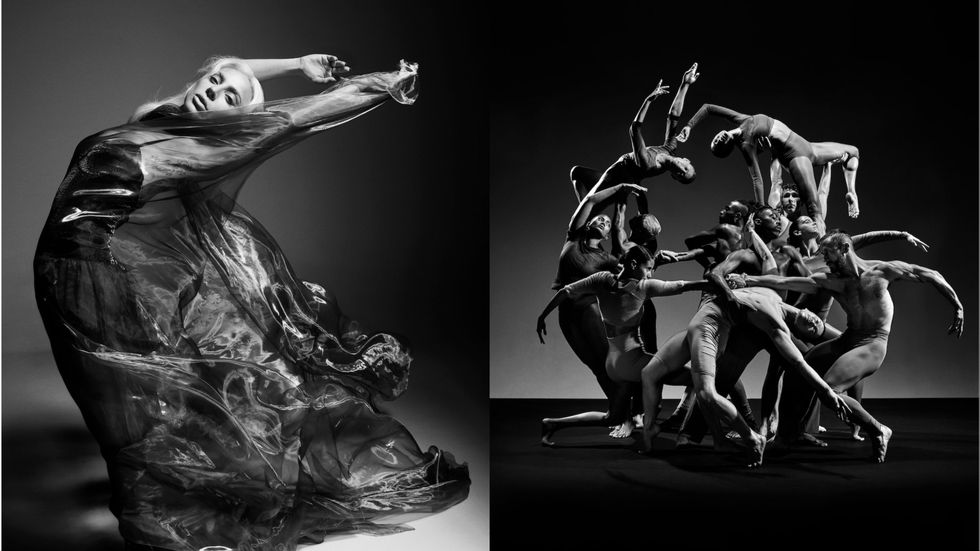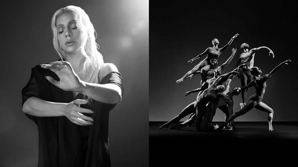 Captured in both color and black-and-white, the striking video is also perfectly paired with several diptychs by famed photographer Mario Sorrenti, who manages to catch Gaga in a series of artful poses and juxtaposes them with images of the dancers following her lead — still images that act as a perfect mirror of the video.
