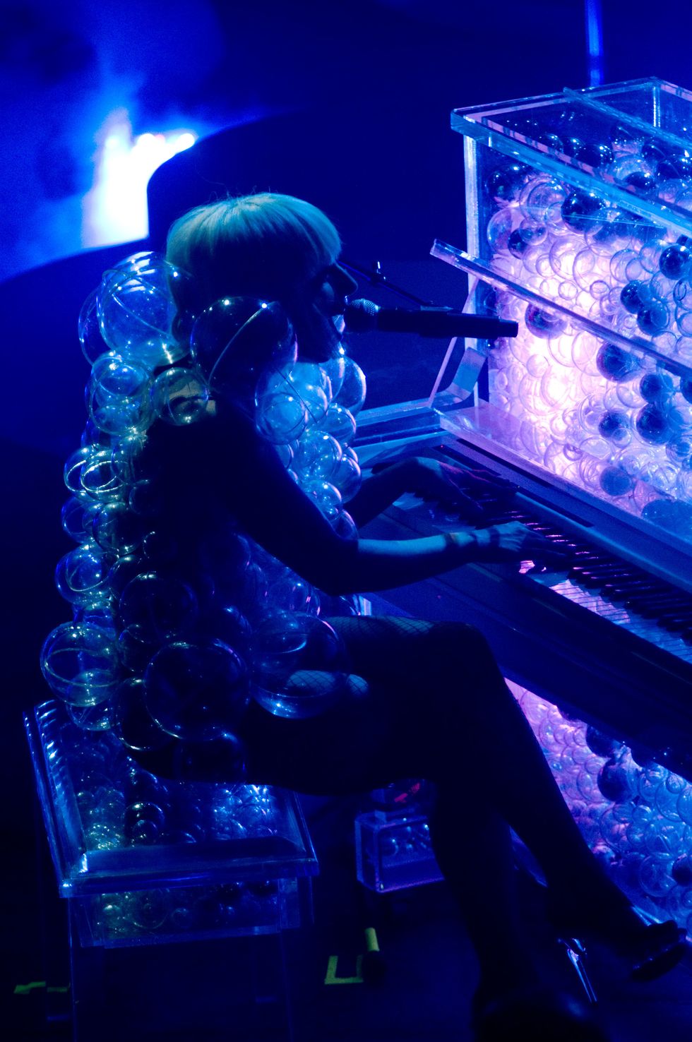 Her acoustic piano set has become a performance highlight today, but was just as strong in the beginning of Gaga's pop tenure. It's where her songwriting starts, and where Gaga feels the most comfortable on stage. Wearing a replica of Hussein Chalayan's iconic 2007 bubble dress, Gaga sat down with a matching clear piano, filled entirely with plastic bubbles and whimsical starfish. She sang a stripped down version of "Poker Face" — now a classic — but also introduced a never-before-heard track, called "Future Love," which would unfortunately never see a proper studio release. The song was signature Gaga, somehow wielding a love story with bizarre cosmic references. "When he gets back from outer space, I'm gonna punch him in his face," she sang. "My eyeliner runs in constellations for you dear." Though she'd famously referenced Ziggy Stardust's lightning bolt makeup on The Fame artwork, this moment felt like peak Bowie.
