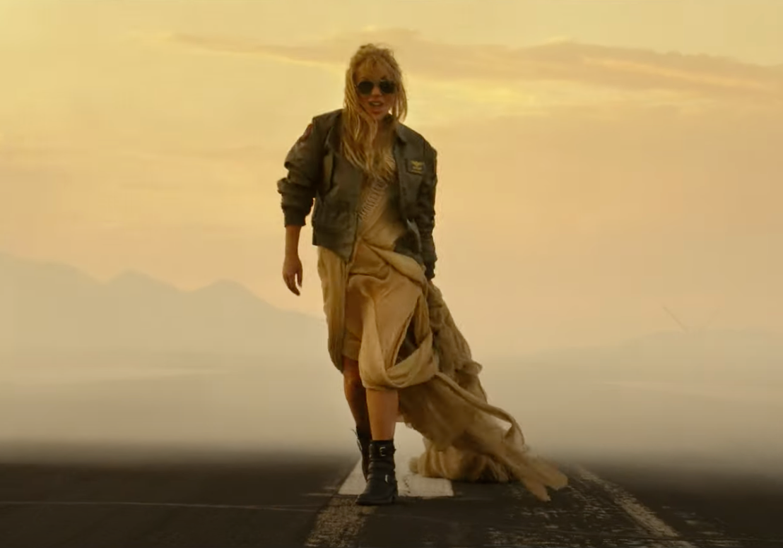 But midway through the music video, when her vocals reach a crescendo, the camera cuts to Gaga storming through a tarmac wasteland wearing something much more commanding: a parachute-inspired dress crafted from 200 yards of fabric with ropes and a dramatic cape that blows powerfully in the wind.