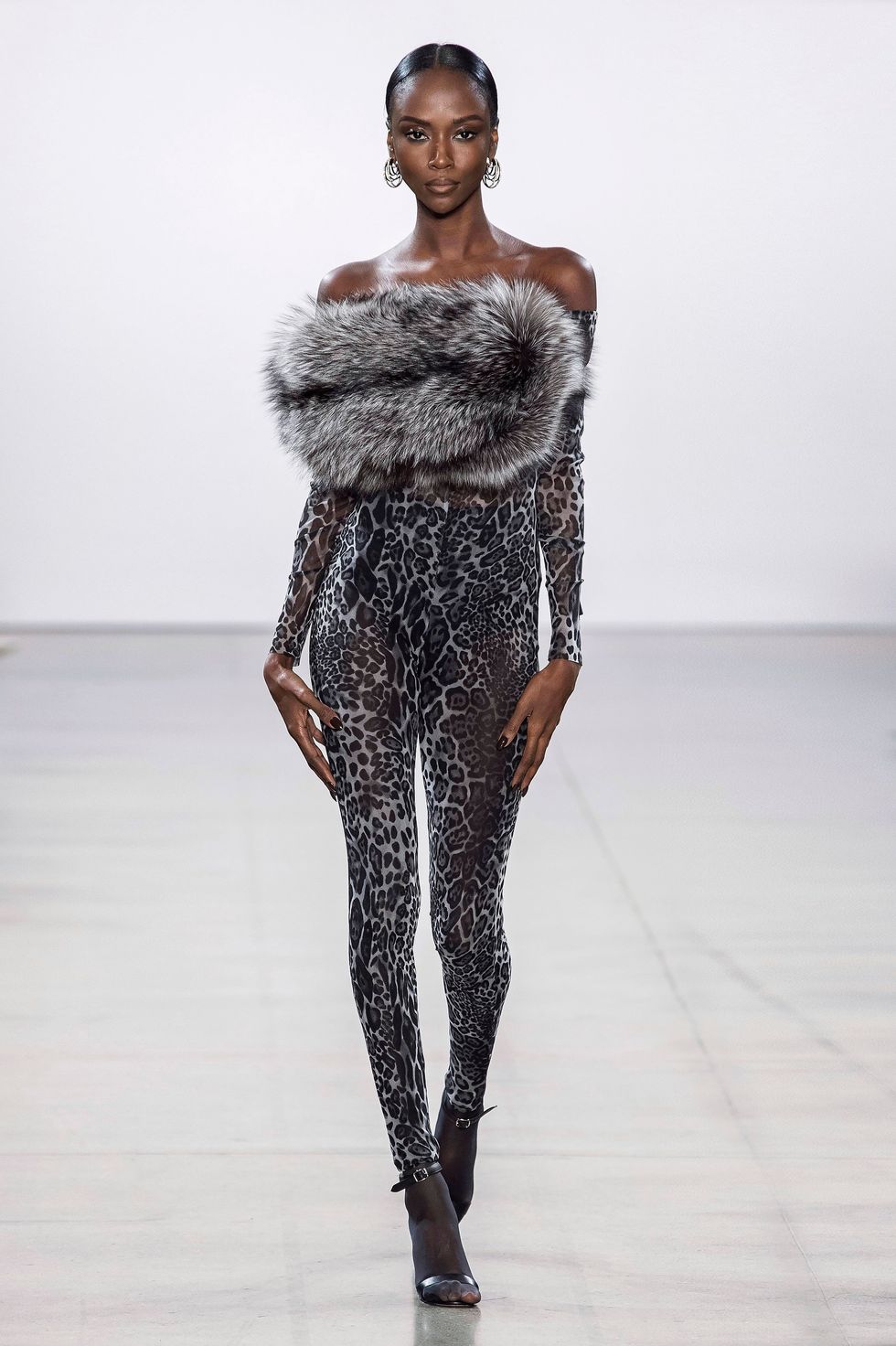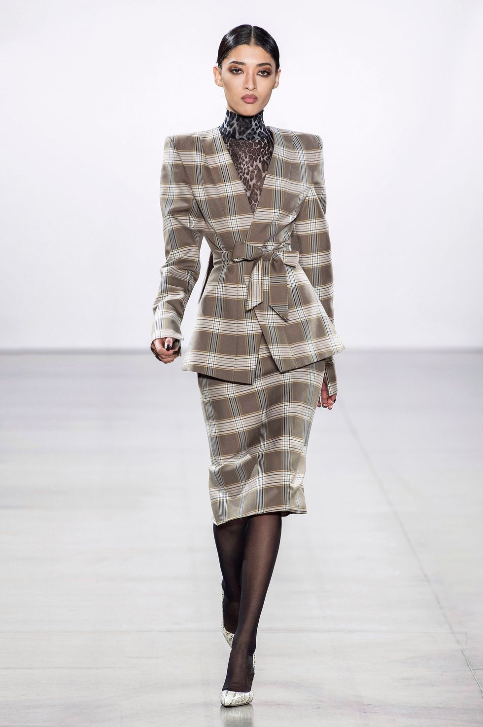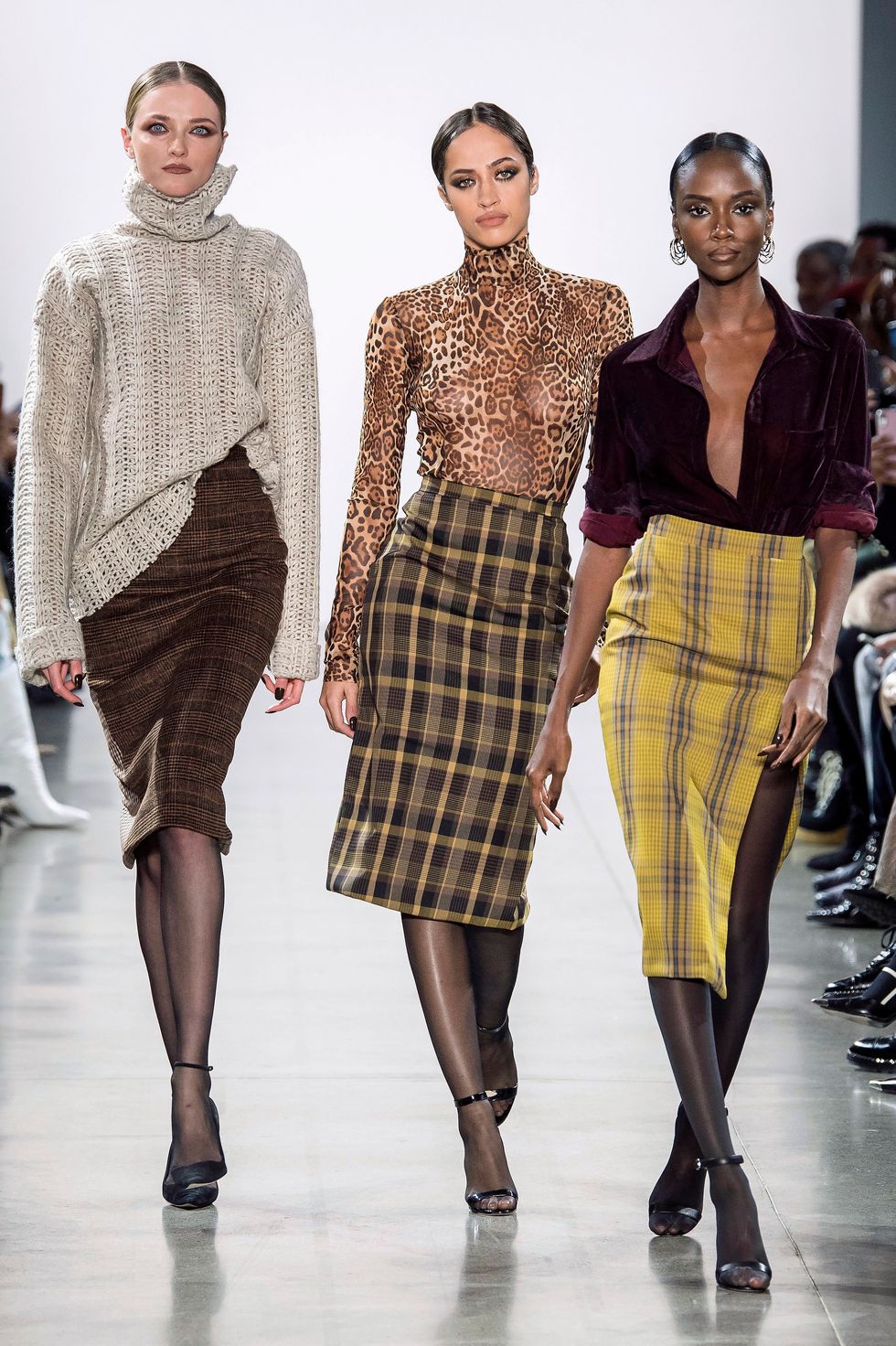 Plaid textiles and wool fabrics were unconventionally paired with body-con tailoring, and midi-length evening dresses and pencil skirts were accompanied by suggestive slits and sky-high heels. The designer's use of fur also invoked a sense of affluence, styled with various animal prints to create the ultimate vixen. "I wanted everything to be sexy and expensive," Smith told WWD. "I wanted her to be super strong and super confident. I didn't want to shy away from it this season."