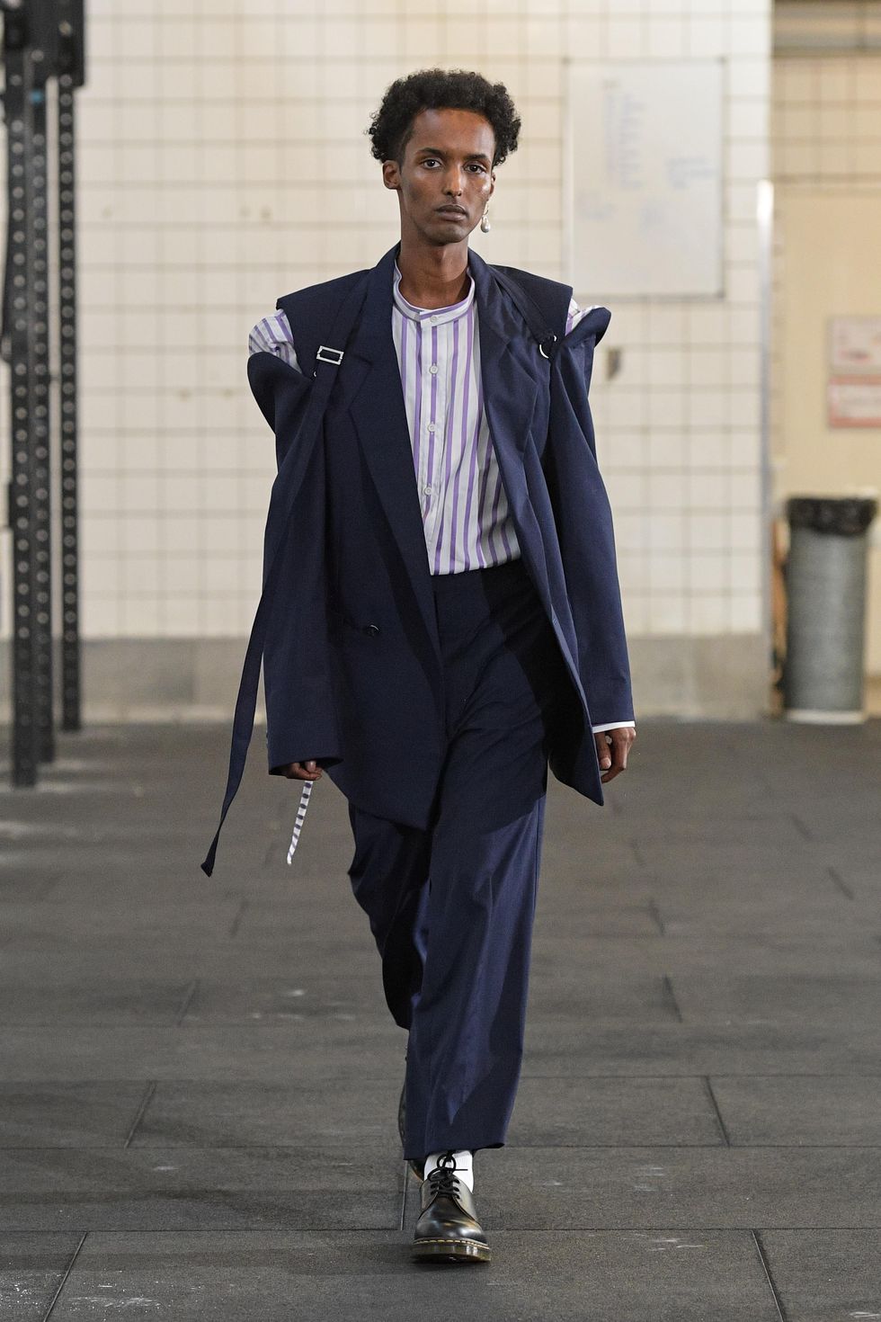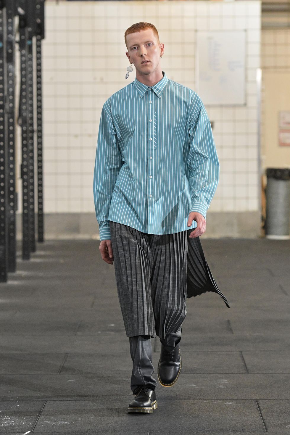He showed the collection at a local gym with Crossfit trainers lifting weights and getting some pumps in, the location chosen for its place "as a temple for the performance of masculinity: a place where all senses are obtained and corrupted to preceive dominance, power and stamina." For most of the amateur models who walked the show, it was their first time on a runway.