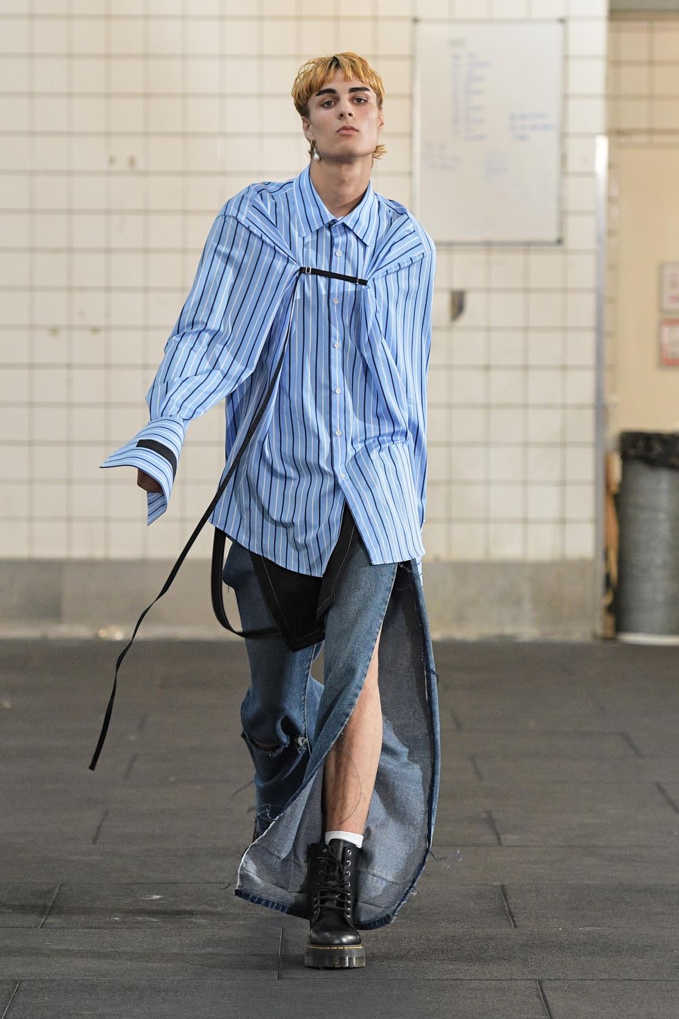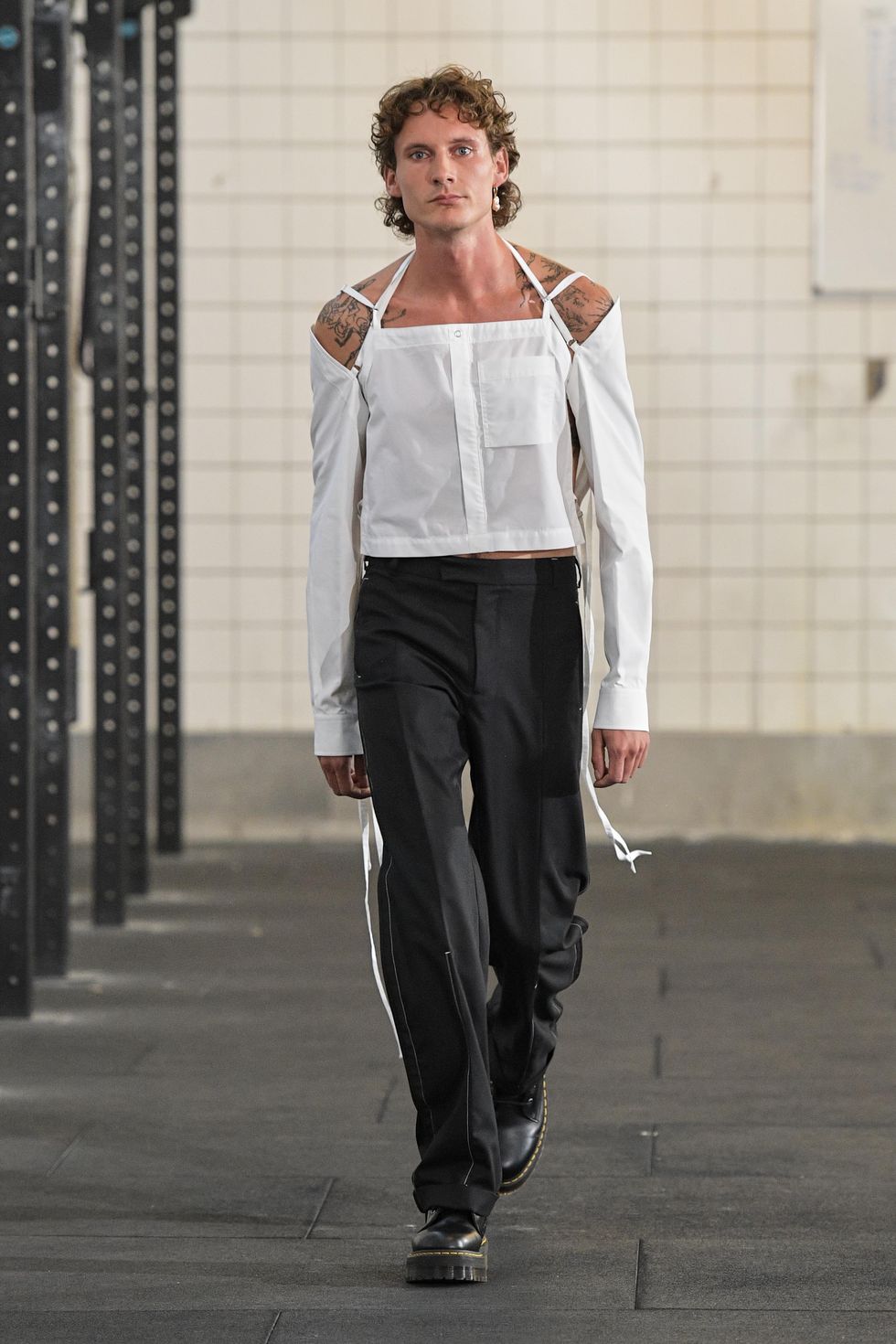 Indeed, the collection's traditionally masculine tropes — shirting, suits, neckties — were all infused with a twisted, almost perverse edge thanks to skewed proportions, cutouts and off-kilter silhouettes.