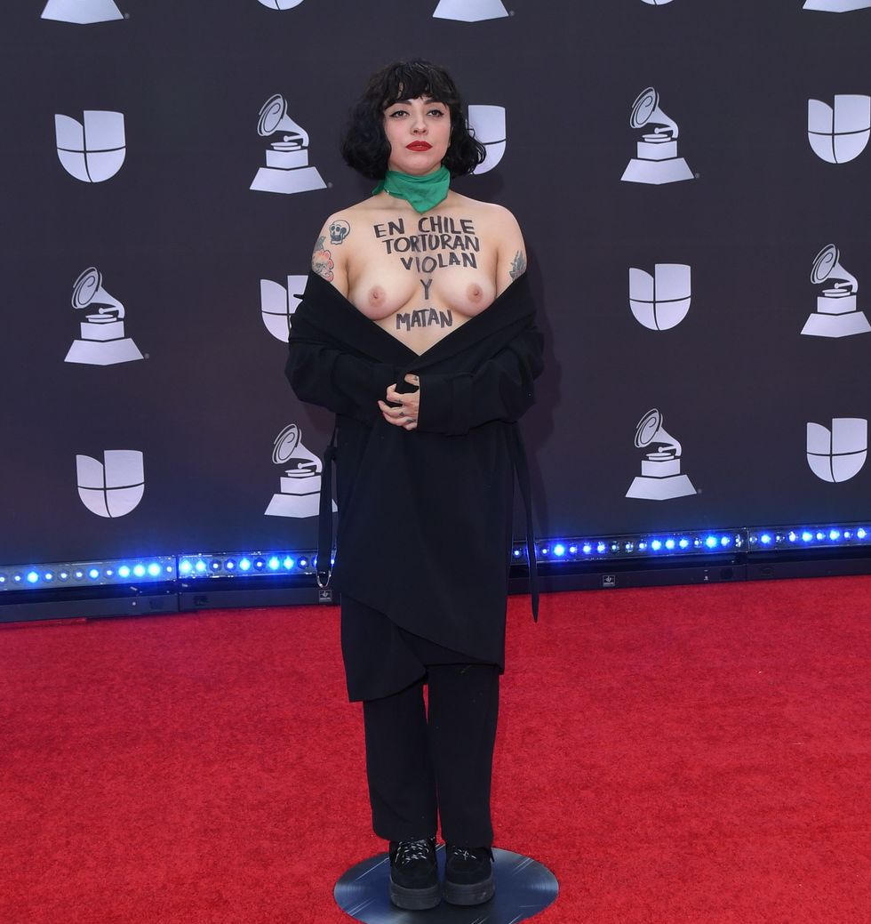 The Mexican-Chilean musician joined the long, rich tradition of nude female protest, painting "En chile torturan violan y matan" ("They're torturing, raping and killing in Chile")on her bare chest. Her message specifically calls out the brutal treatment of demonstrators by police in recent weeks. According to CNN at least 20 people have died due to police brutality and resulting fires in Santiago. The civil unrest over inequality in Chile was sparked by an October subway fare hike.