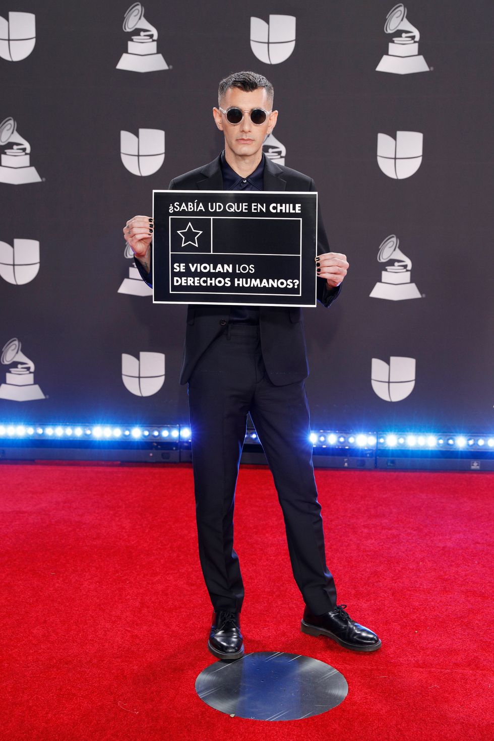 Anwandter took a break from rallying in his hometown of Santiago to attend the Latin Grammys. He walked the red carpet in funeral black with a sign, asking "Sabía ud que en chile… se violan los derechos humanos?" ("Did you know that in Chile, human rights are being violated?") He lost Best Alternative Album to Mon Laferte, but last night they were on the same team.