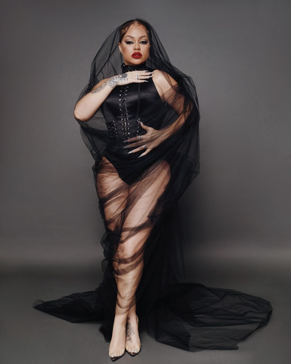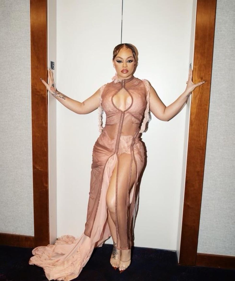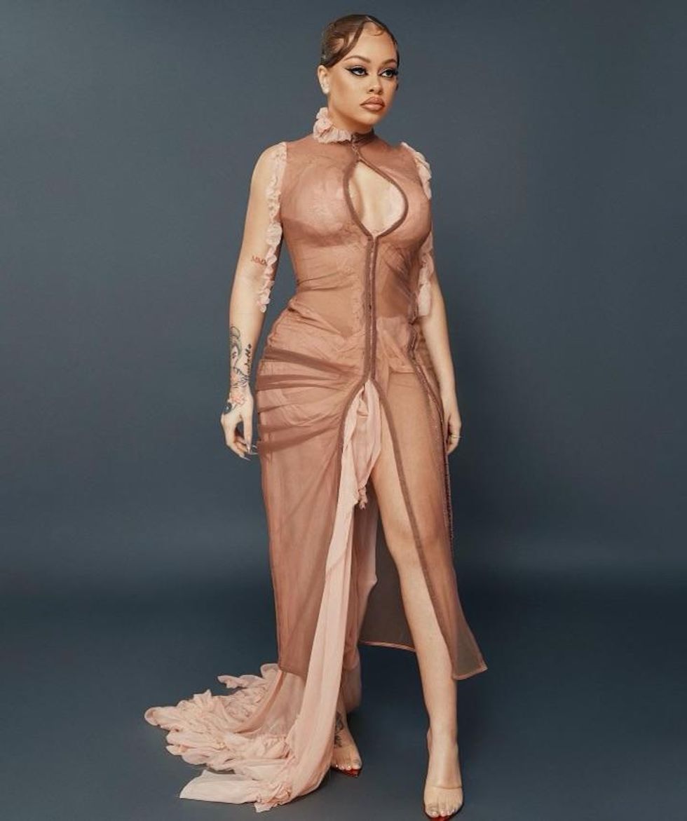 Latto’s stage look, a stringy dusky-rose gown, contrasted the severity of the first look with soft ripples and delicate sheer layers that evoked a ghoulish jellyfish vibe. The Turkish-British fashion designer’s devilish and ethereal designs are show-stopping creations heralded by the likes of Bella Hadid, Lady Gaga, Madonna and FKA Twigs.