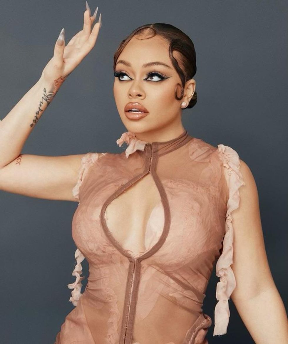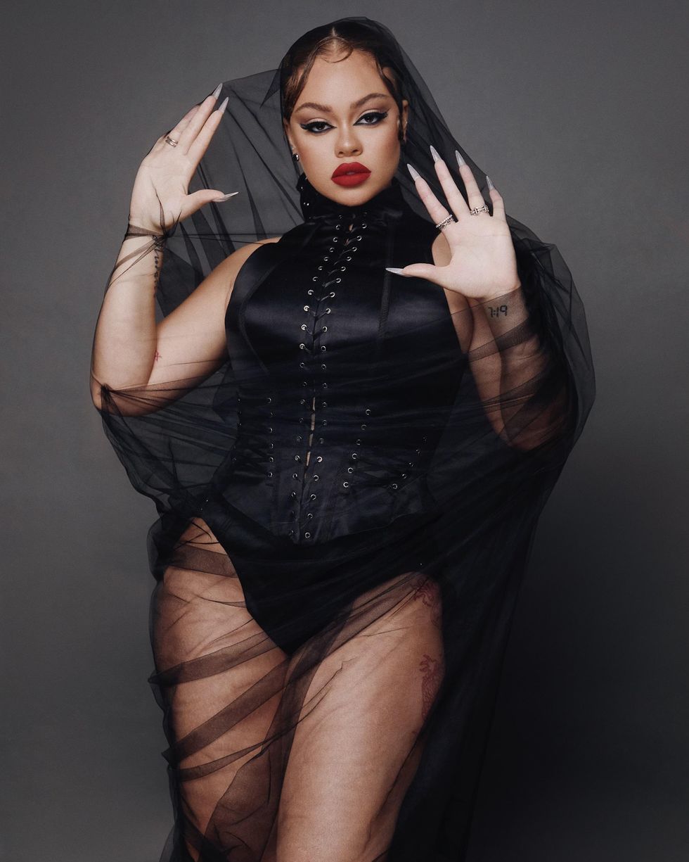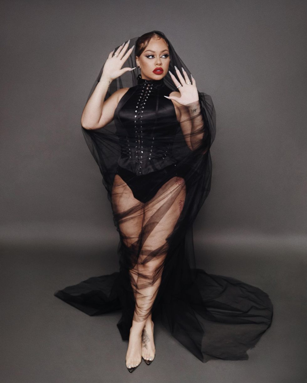 Latto’s stage look, a stringy dusky-rose gown, contrasted the severity of the first look with soft ripples and delicate sheer layers that evoked a ghoulish jellyfish vibe. The Turkish-British fashion designer’s devilish and ethereal designs are show-stopping creations heralded by the likes of Bella Hadid, Lady Gaga, Madonna and FKA Twigs.