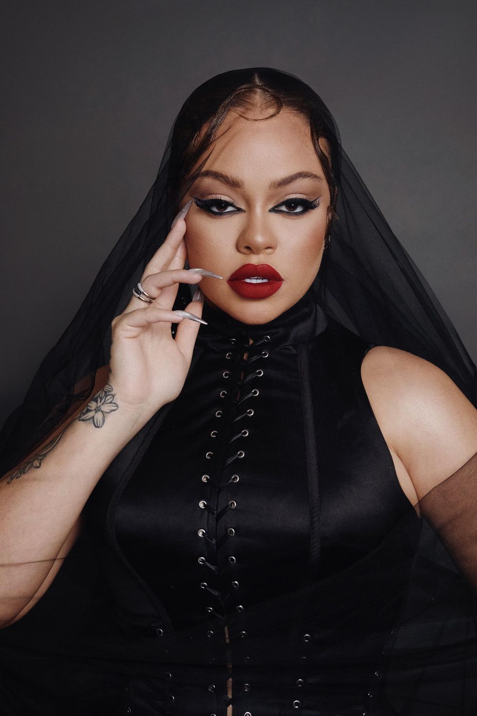 The gothic sexuality of Dilara Findikoglu’s designs paired exquisitely with Latto’s confident and coquettish demeanor. Styled by Sam Woolf, Latto arrived on the red carpet in her first Dilara look of the night: an all-black corseted lingerie number, featuring a halter-neck bodysuit with lacing up the bodice and a mesh overlay veiled over her head and down her legs. The textured-tulle BDSM vibe was brightened with a bright red lip and Egyptian cat eyeliner.