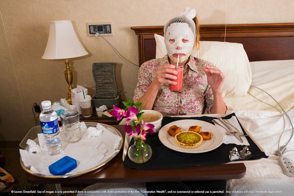 Dr. Steven Teitelbaum's forty-nine- year-old patient, who is recovering from a full-face laser resurfacing and an upper eye lift, eats lunch in a private room at Serenity, a luxury aftercare facility that offers private chefs, spa treatments, and twenty- four-hour nursing, Santa Monica, California, 2006. Photo Courtesy of Amazon Studios. Photo credit: © Lauren Greenfield, all rights reserved.