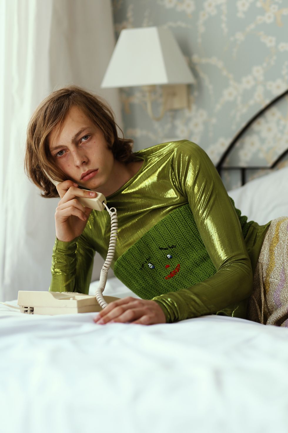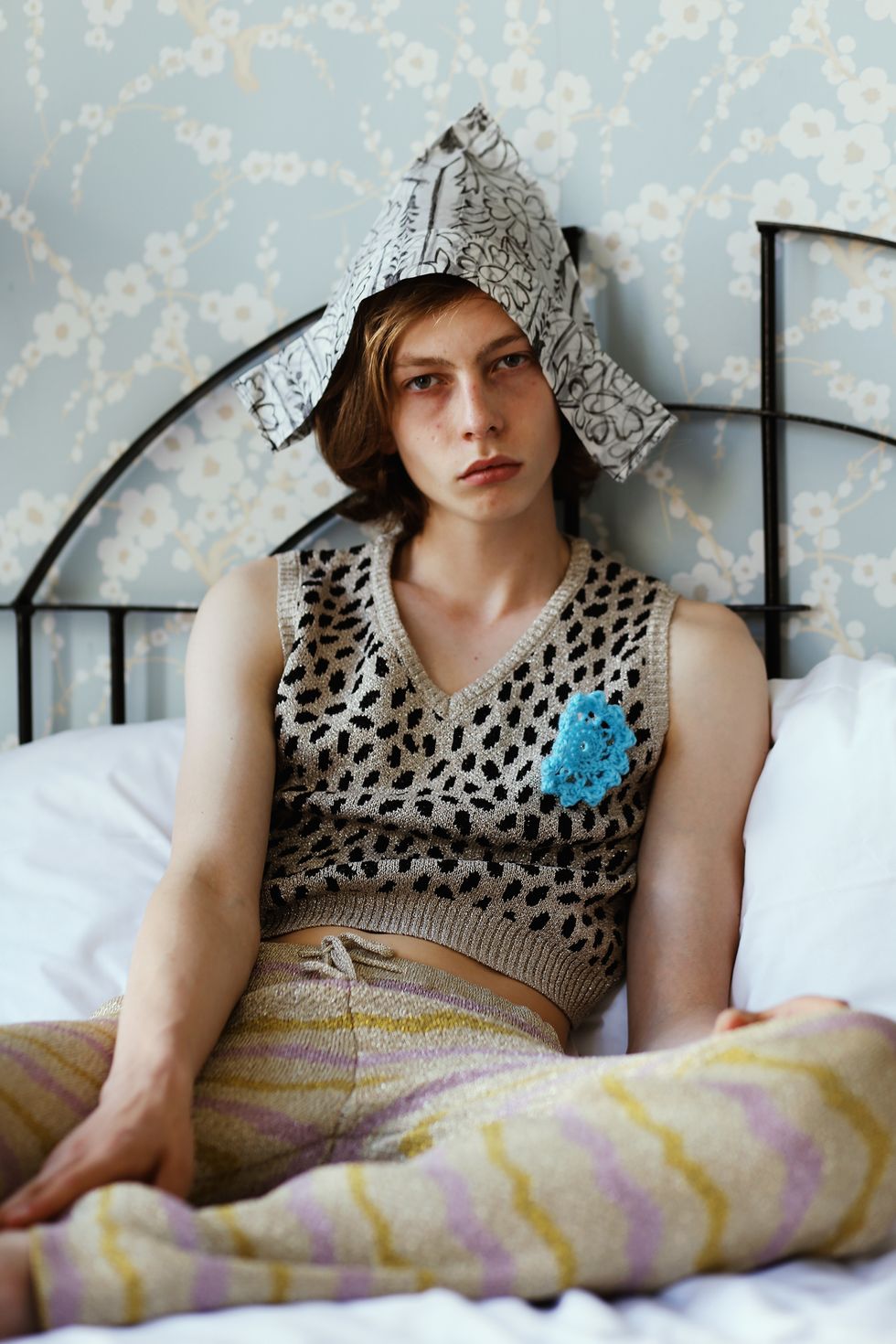 Their latest fantasy-driven collection, "PLAYDATE," sees the duo of Lazo and Schmidl at their best with flowing organza blouses, sequined halters, knitted pants, and bedazzled tops in their signature lurex. Drawing inspiration from an adolescent reading of Roald Dahl and Franz Kafka, the collection interjects youthful whimsy with sexually charged undertones. Mock paper hats made out of organza and a leotard that reads 'wet dream' in rhinestones exposes a coming to terms with sexual expression. "It's never the message of sexuality; it's more of the message of sexiness for yourself," says Schmidl.