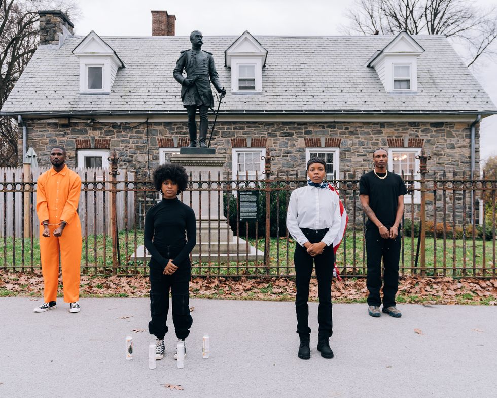 Throughout the film, which was shot on a former slave plantation, an all-Black cast highlights these values. A striking opening pan of the plantation's grounds shows the cast arranged in front of its gates. Brittany Winbush's neck is wrapped in an American flag. Brint Benson dons a bright orange prison uniform, his hands cuffed. Courtnie Henson wears an all-black outfit, surrounded by prayer candles. Jonathan Richetts wears a casual streetwear look, accented with gold necklaces and gold chains wrapped around his wrists like handcuffs.