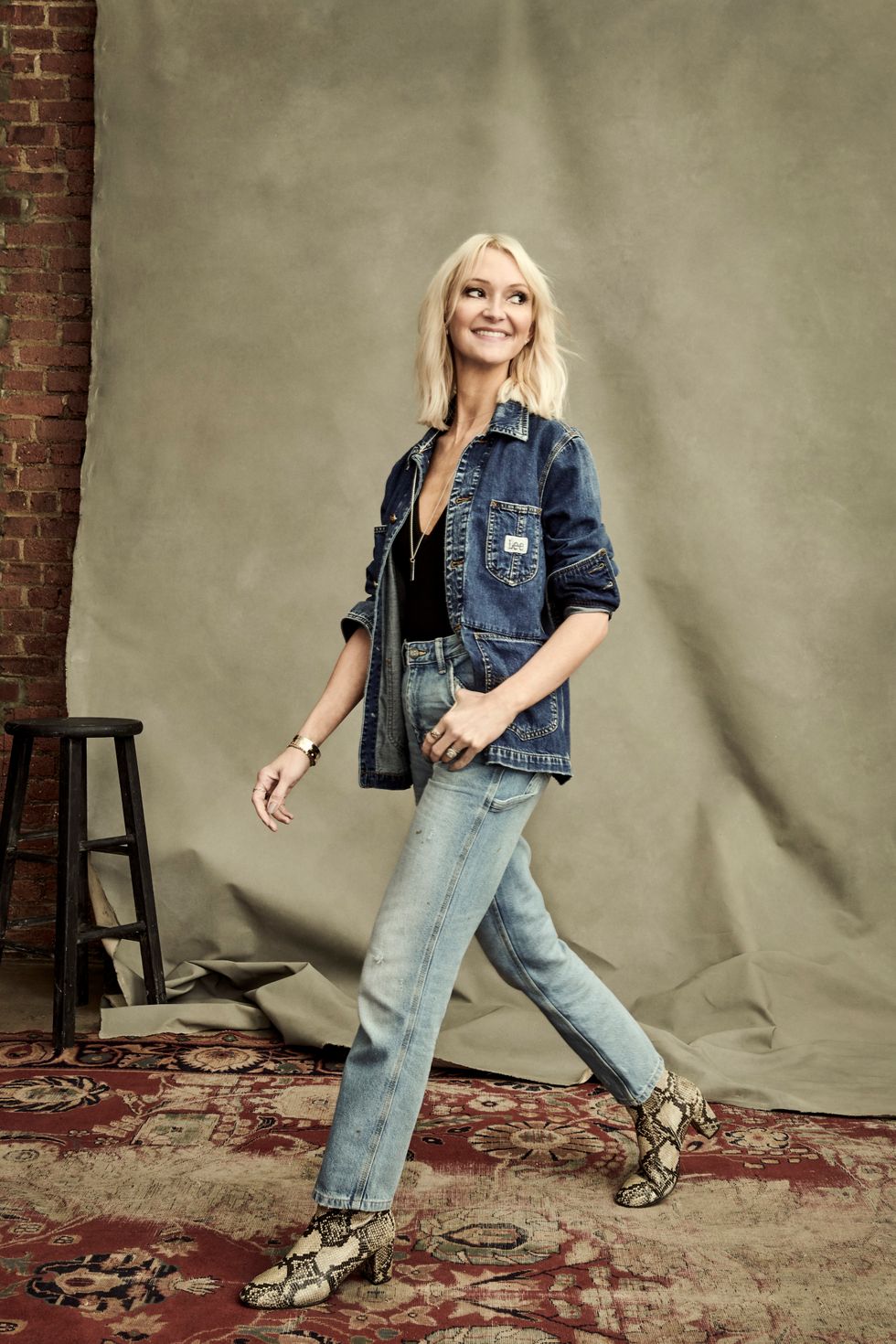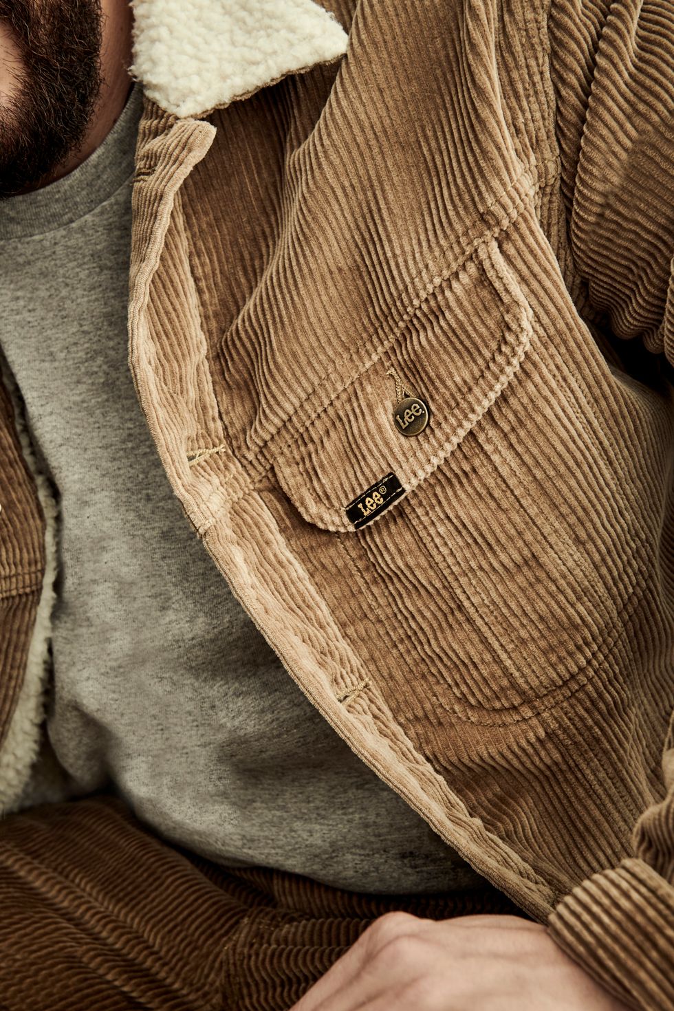 "Lee Vintage Modern" also sees Lee's first official "dad jeans," an elevated take on the men's Union-all, hickory-striped (a print originally meant to conceal oil stains) carpenters pants, a barn jacket and a fuzzy-collared sherpa coat.