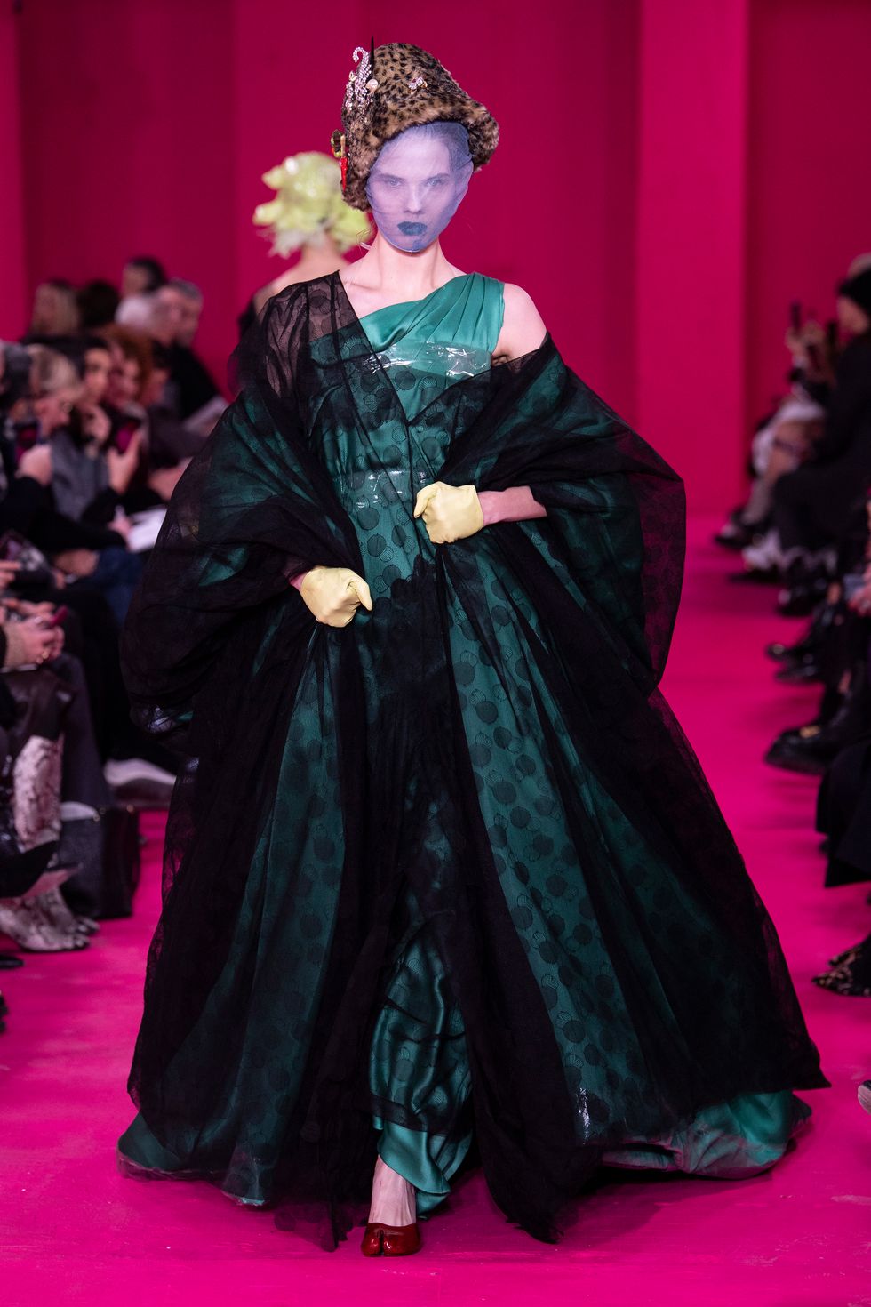 Additionally, the majority of clothes were made from repurposed and upcycled materials, taking traditional bourgeois fabrics and hacking and twisting them to create deconstructed fantasies. Standouts included a lime green coat, an emerald gown and all the irresistible face masks. See, below, for some of the most notable looks.