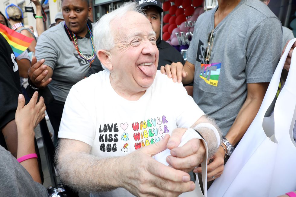 I chug a bottle of water and gesticulate wildly with a Pride-themed fan in an attempt to fully liberate the sweat from my body. It works. Around a bend, I spot Leslie Jordan, 4'11" and beaming, trying on shoes. "Oh I just love these," I hear him coo in that familiar Tennessee twang. With his shoes for the day now procured, Jordan is ready.