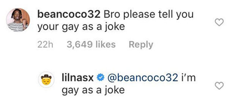 And though the response to his announcement appears to be overwhelmingly positive, since this is the internet, there had to be at least a few shitty homophobes in the comments — with some making nasty comments about how the "Old Town Road" line about how he's "gonna ride 'til I can't no more" was an allusion to his sexual orientation.