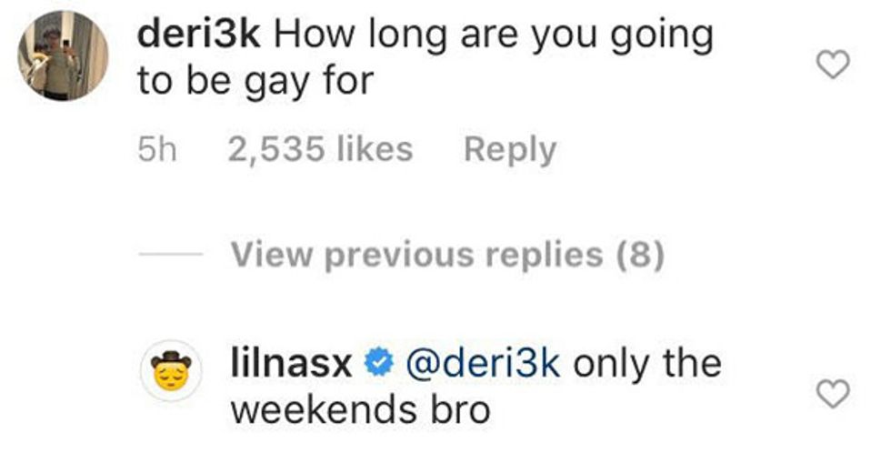 Unfortunately, things got even uglier in his Instagram comments. Under a post celebrating "Old Town Road's" historic Billboard run, trolls piled on, writing things such as "Bruh why you gay" and "someone I looked up too [sic] as a great person who makes dope music turned gay. smh."