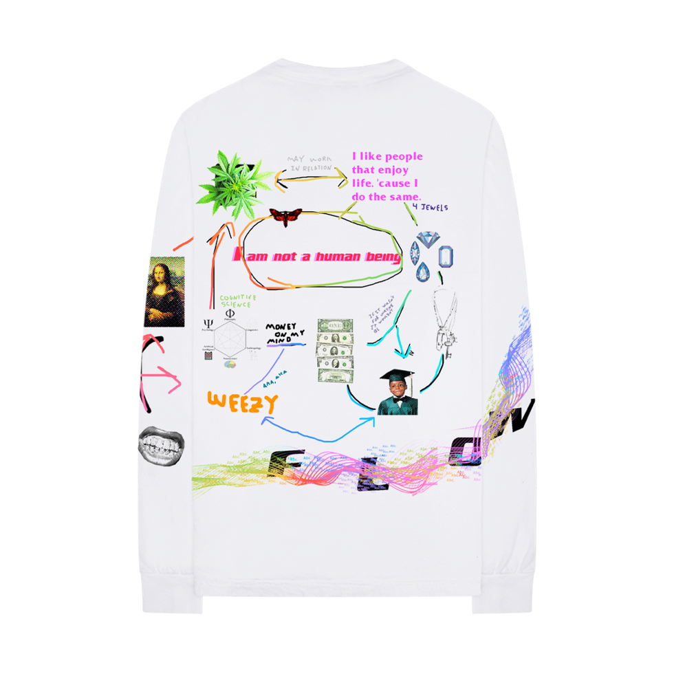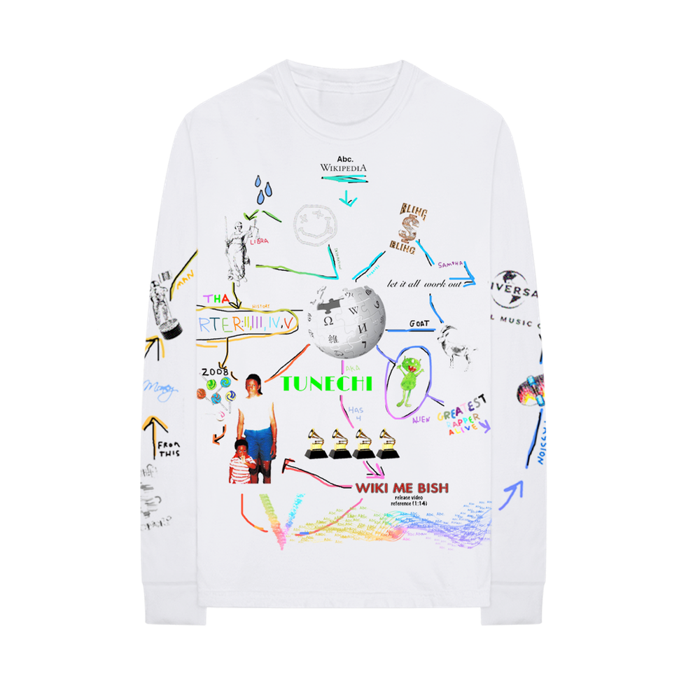 In what is actually the pair's second collaboration, the digitally influenced streetwear brand teamed up with the internet lexicon to create a pictorial word-web of the rapper and wrapped it around a long-sleeve. Pulling off of Lil Wayne's Wikipedia page, Advisory Board Crystals pairs visual factoids, like his five Grammy wins, with lyrics from the recently released, long anticipated, album in a colorful, playful explosion of information. Advisory Board Crystals will also donate a portion of the sales of the shirt to the Wikimedia Foundation, which helps keeps everyone's go-to reference guide and argument settler free for all.