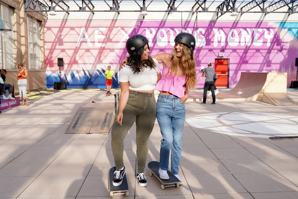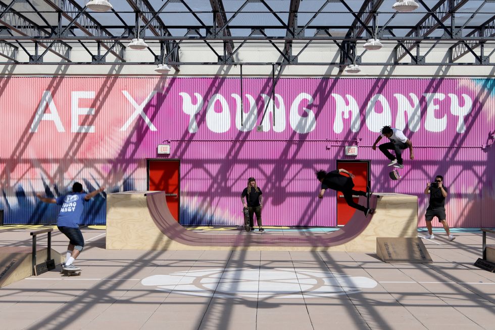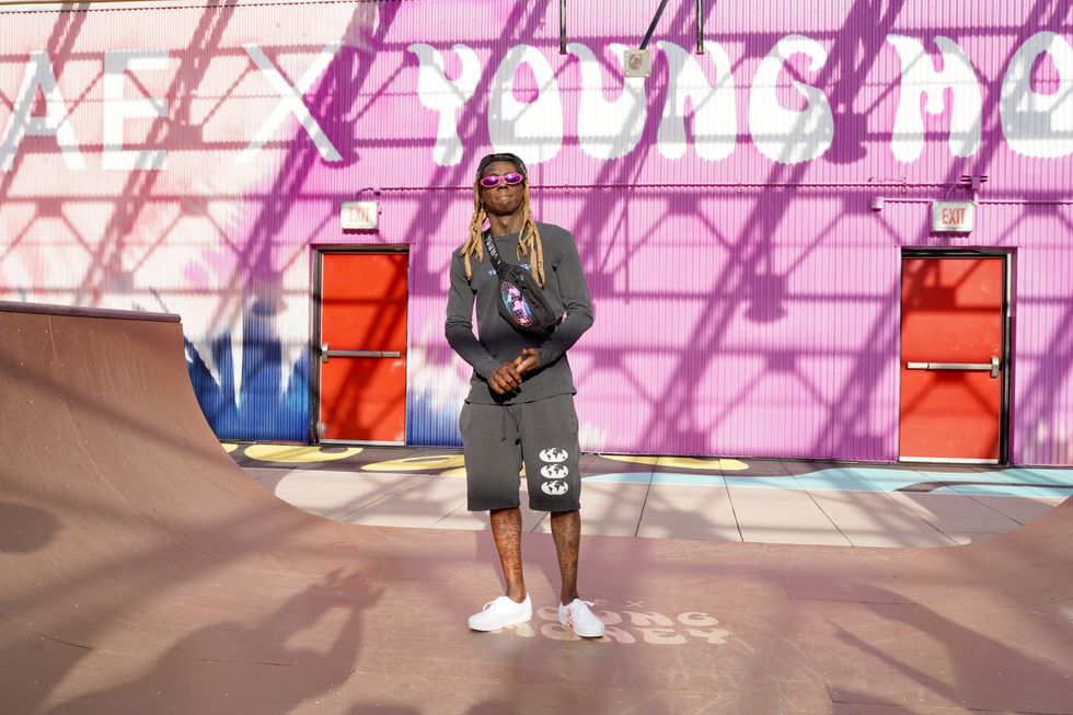 Guess what? Lil Wayne, under-acknowledged inventor of skinny jeans, is collaborating with the denim experts at American Eagle. The greatest rapper alive unveiled his skatewear-influenced AE x Young Money collection on the rooftop of downtown Manhattan's New Design High School yesterday afternoon, complete with a boarding session set to the beat of "Uproar" and approximately one million influencers chowing down on a handpicked selection of Weezy's favorite snacks. And sipping cups of (substance free) purple punch.