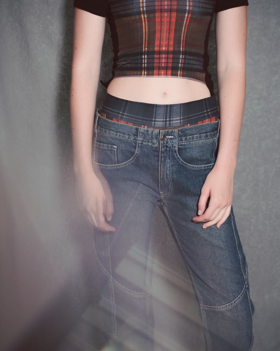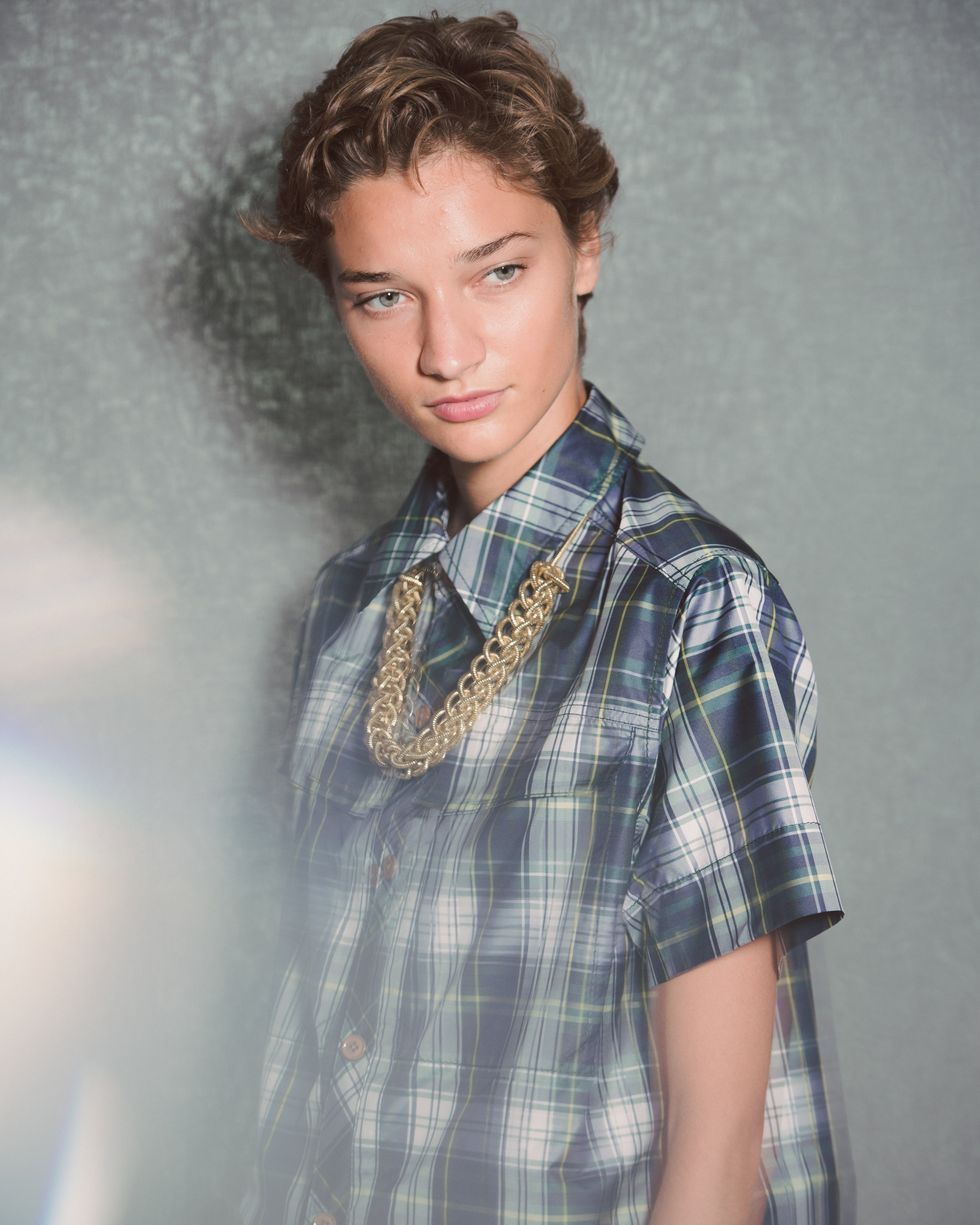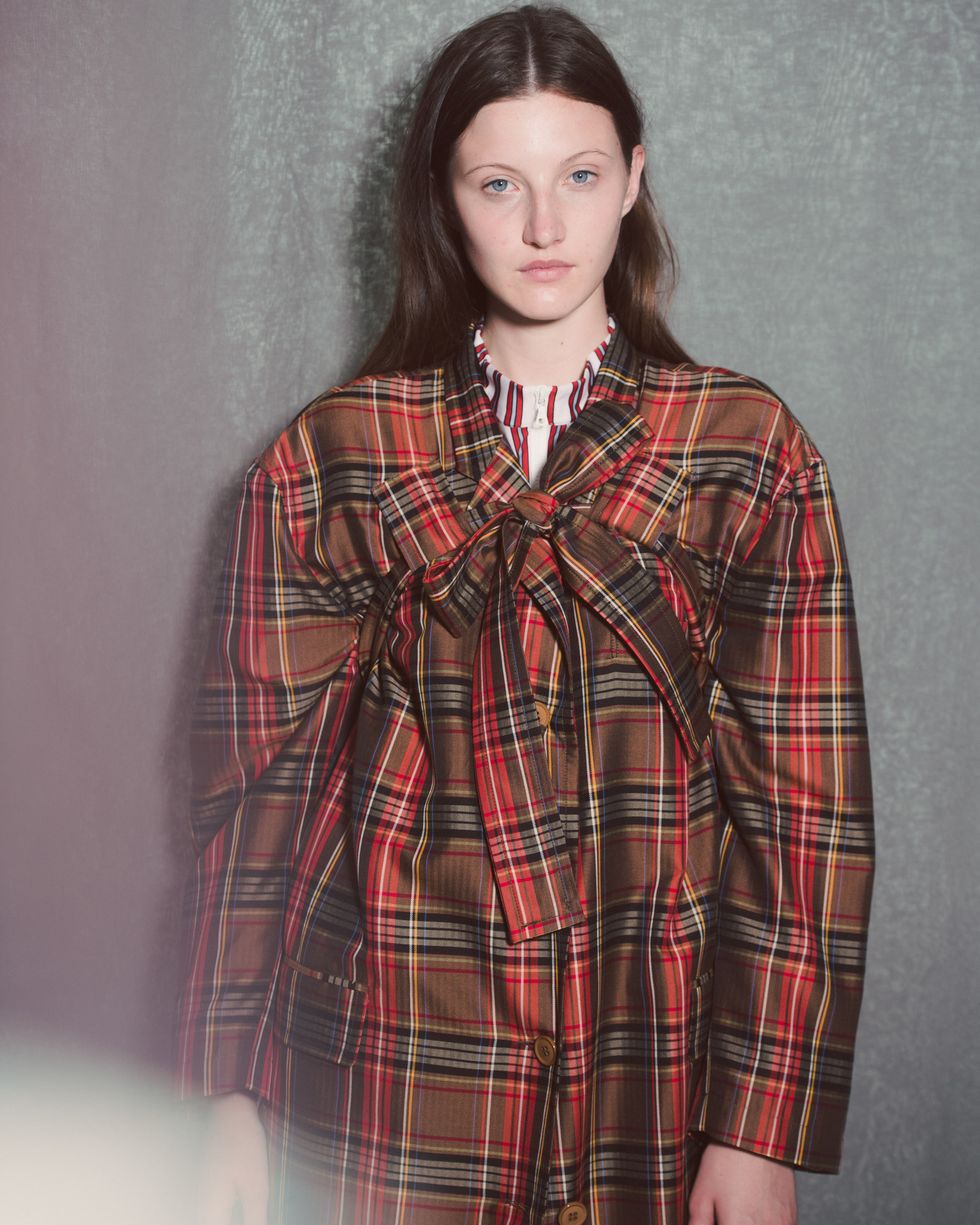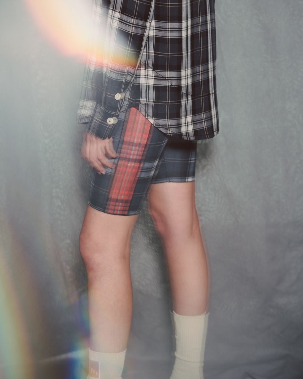 "In the design process, Kirk said to me, 'Sam, you're always wearing ugly plaids and combining them in a funny way. They shouldn't be kept out of the collection,'" Linder says referring to his menswear counterpart Kirk Millar. Consequently, mauve, green, red, and gray iterations of the pattern cover streamlined pieces including a double-breasted blazer, trench coats, bike shorts, and leggings.