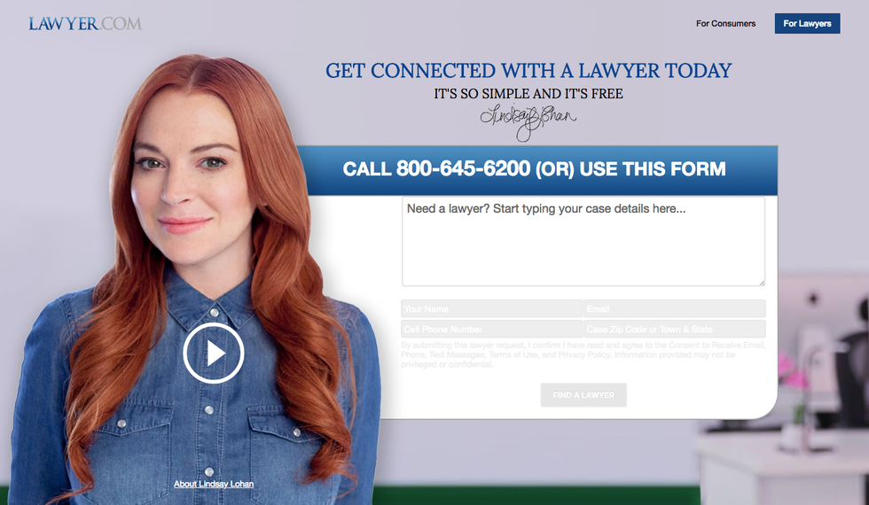 "When Lawyer.com first reached out to me I was confused and a little worried as I thought I was in trouble," Lohan says in the ad. "I realized Lawyer.com is just about helping people, from getting a DUI... Let's not pretend like I didn't get one...or two or three, or some others."