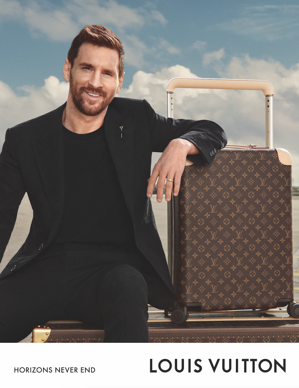 Messi was photographed by Glen Luchford at the airport for the “Horizons Never End” travel campaign. Messi’s in an all-black ensemble as he poses next to the Vuitton’s Horizon suitcase designed by Marc Newson.