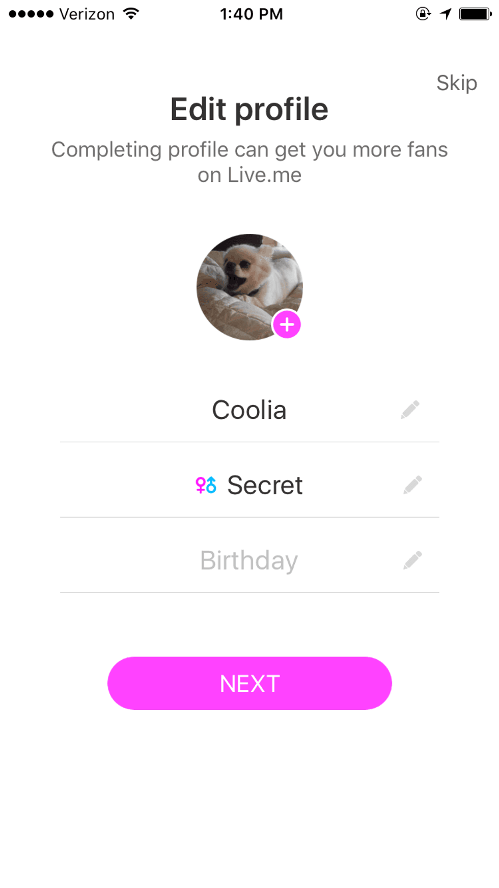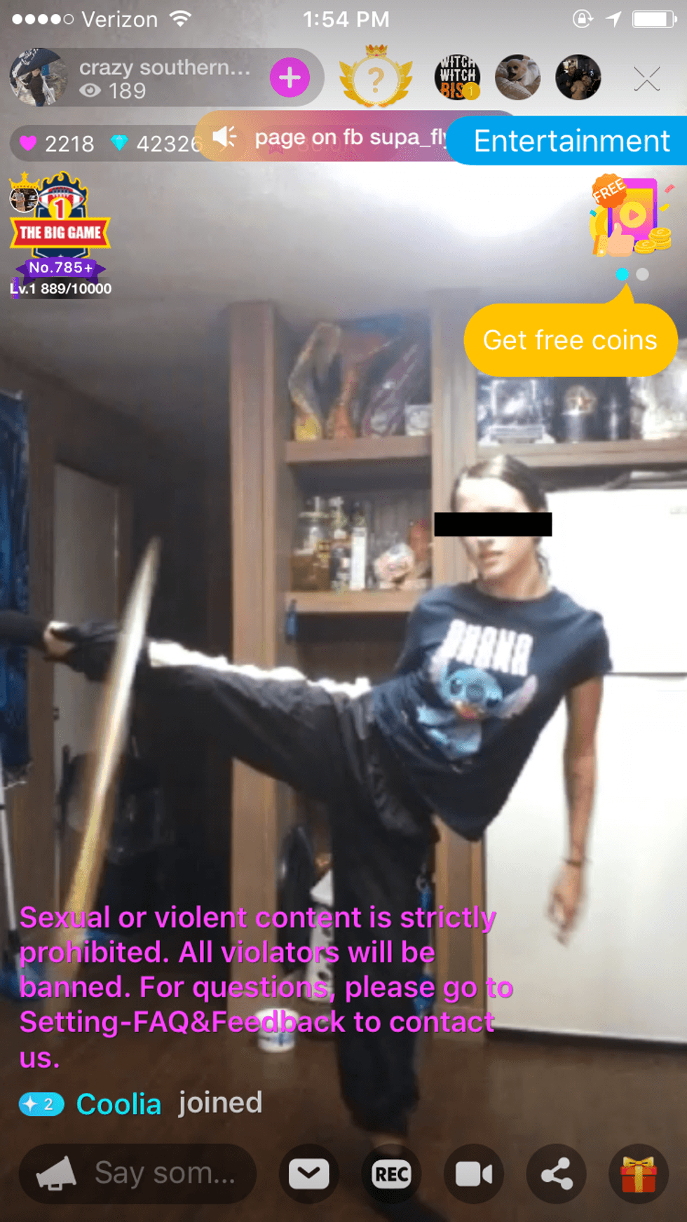 Live.me, I later found out, is a one-year-old live broadcasting app. Users enter into a digital community comprising over 35 million people from around the world, in which they can watch live streams and broadcast their own. From there, users can follow people, comment on their feeds, and — possibly the main draw — send cash gifts. The app also hosts a daily game show broadcast where they give away $2000. In the interest of free money and experimentation, I downloaded the app. I chose the name "Coolia" for my account and used a picture of my dog, for safety.