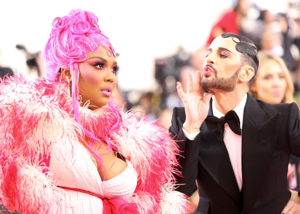 At the 2019 Met Gala, Lizzo leaned into the night's Camp theme gloriously, wearing head to toe hot pink and tons of decadent feathers. Her look, designed in collaboration with Jacobs, was an homage to actress Shirley MacLaine in the 1964 rom-com What a Way to Go! Similar to MacLaine, Lizzo wore a fuchsia updo with jewels and slicked down baby hairs, as well as a sequin gown, complete with an Angelina Jolie-style slit.