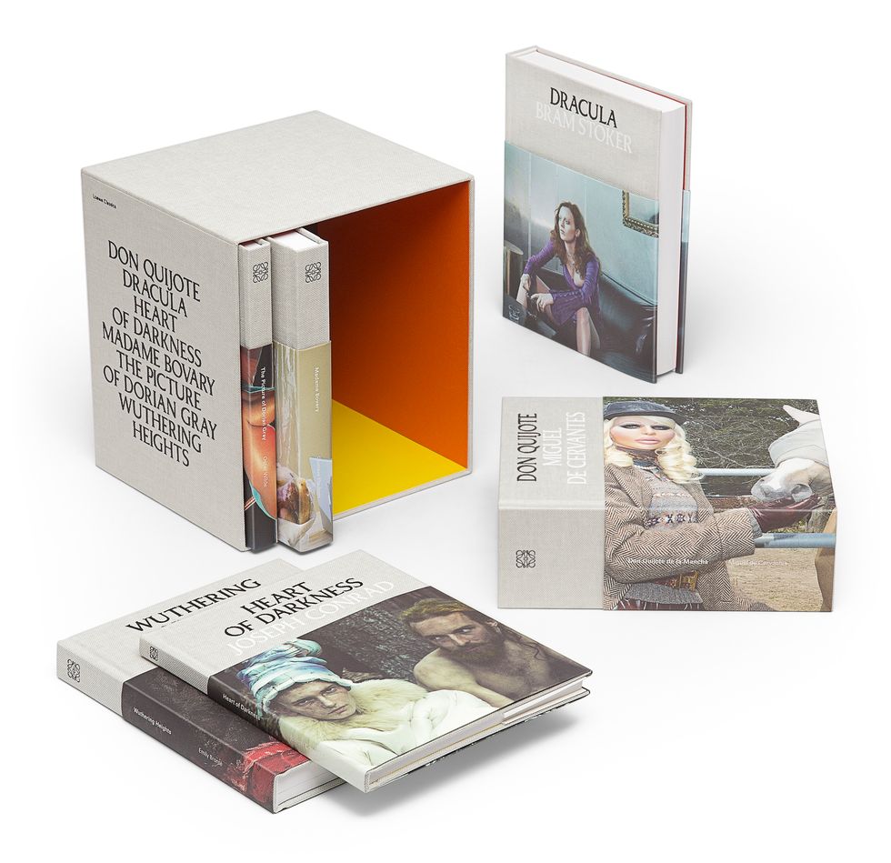 The hardcover books — now available in a limited-edition box set online and at select Loewe boutiques around the world — are bound in taupe canvas and accompanied by sleeves featuring glamorous, archival Steven Meisel images. Each copy's spine is marked with the brand's quadruple-L Anagram logo, while excerpts from the works are printed onto back covers.