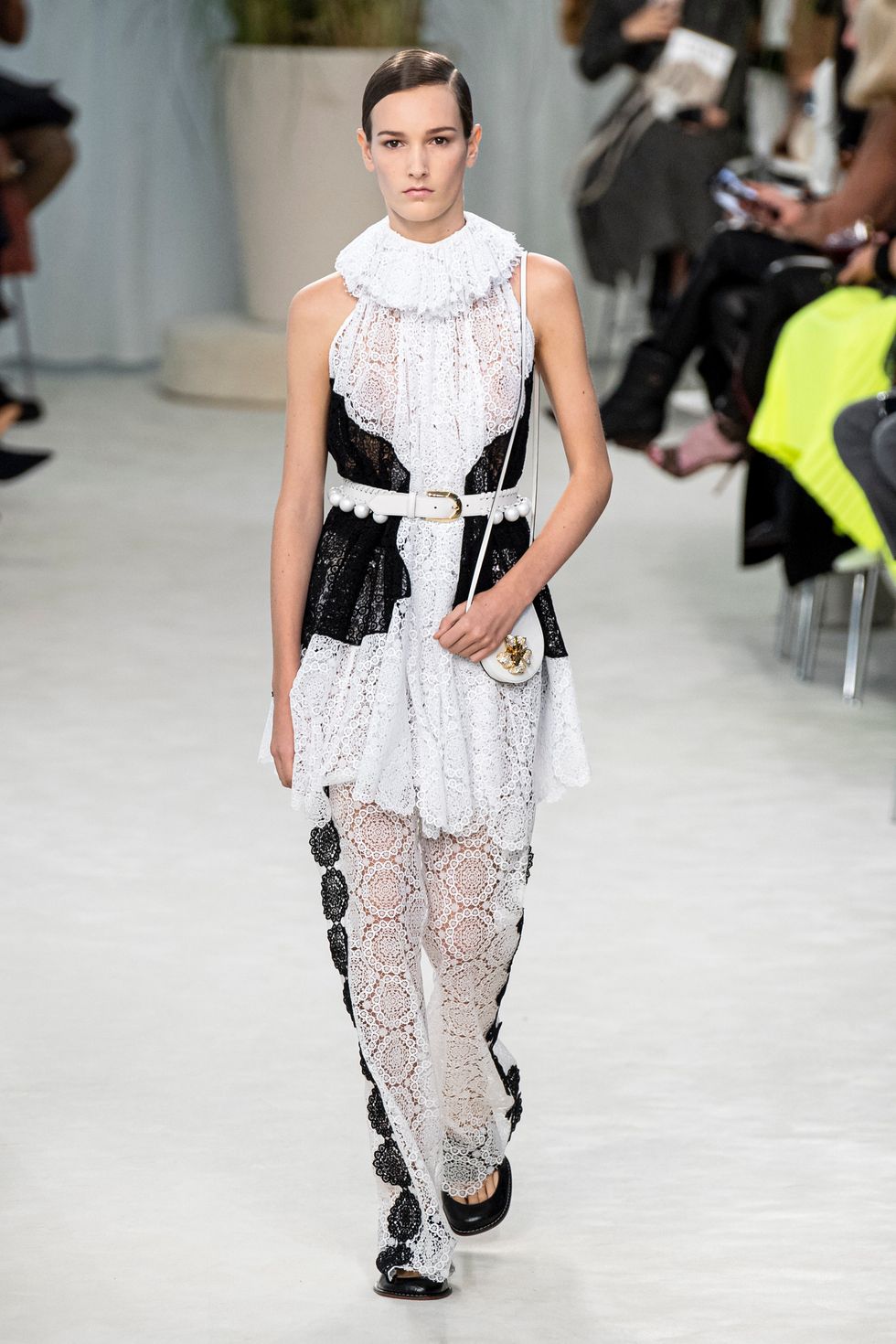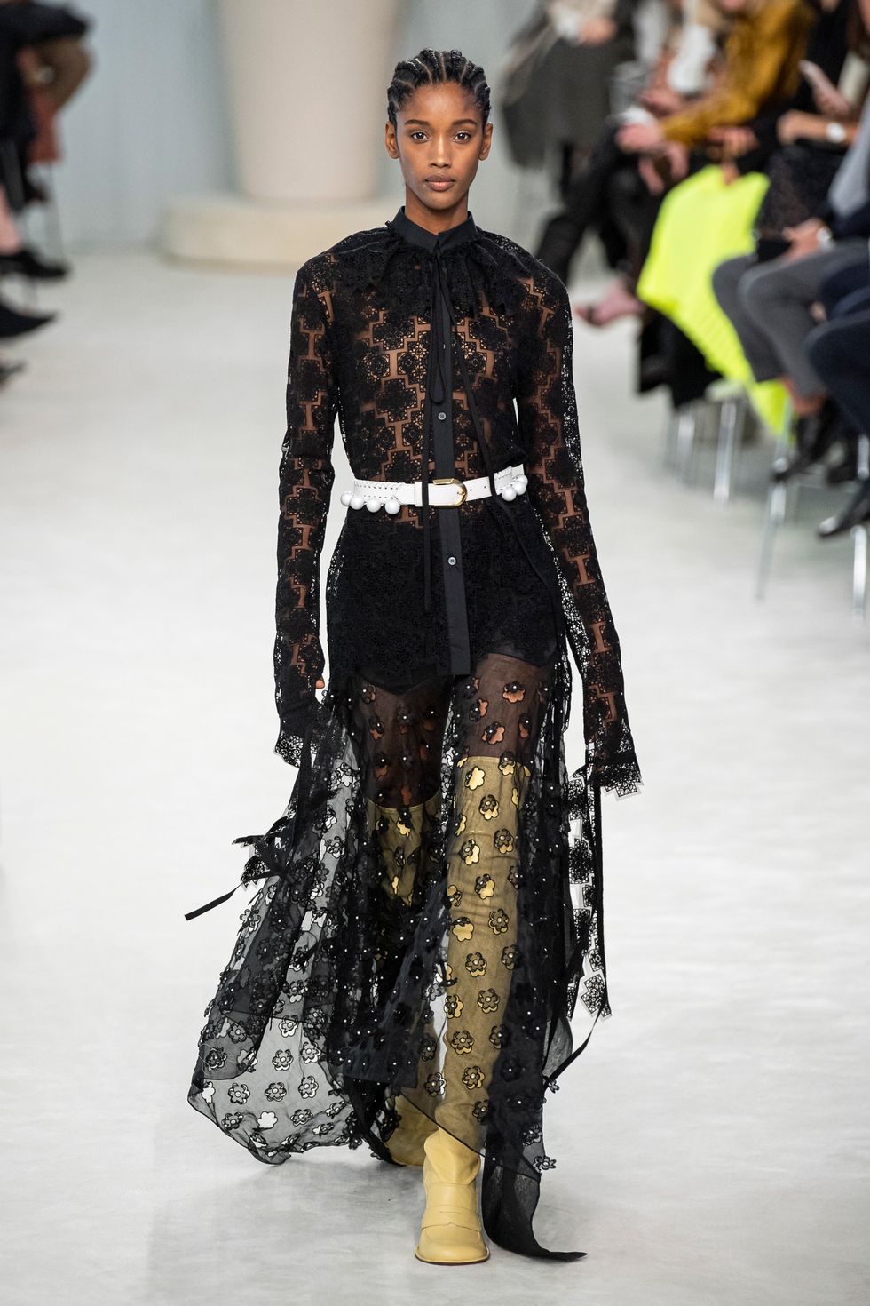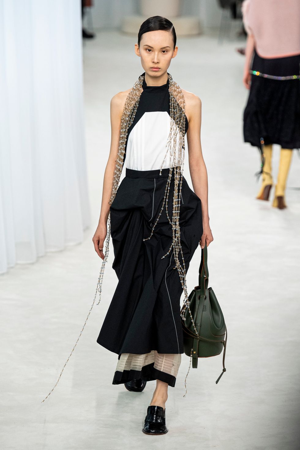 Since Jonathan Anderson took over the reins at Loewe, he's brought new life to the Spanish brand. Accessories and leather goods have really taken off under the British designer, but it's his ready-to-wear where his ideas truly shine. At Loewe, his conceptual design sensibility melds with a crafty, artisanal touch, an essential element of the 170+ year-old company's DNA. For Spring 2020, he incorporated an aristocratic approach to the clothes seen in the intricate lace frocks. Wide-hipped panniers recall the traditional court dresses of 17th century Spain, which nod to the brand's origins in Madrid. Here's everything else you need to know about the collection.
