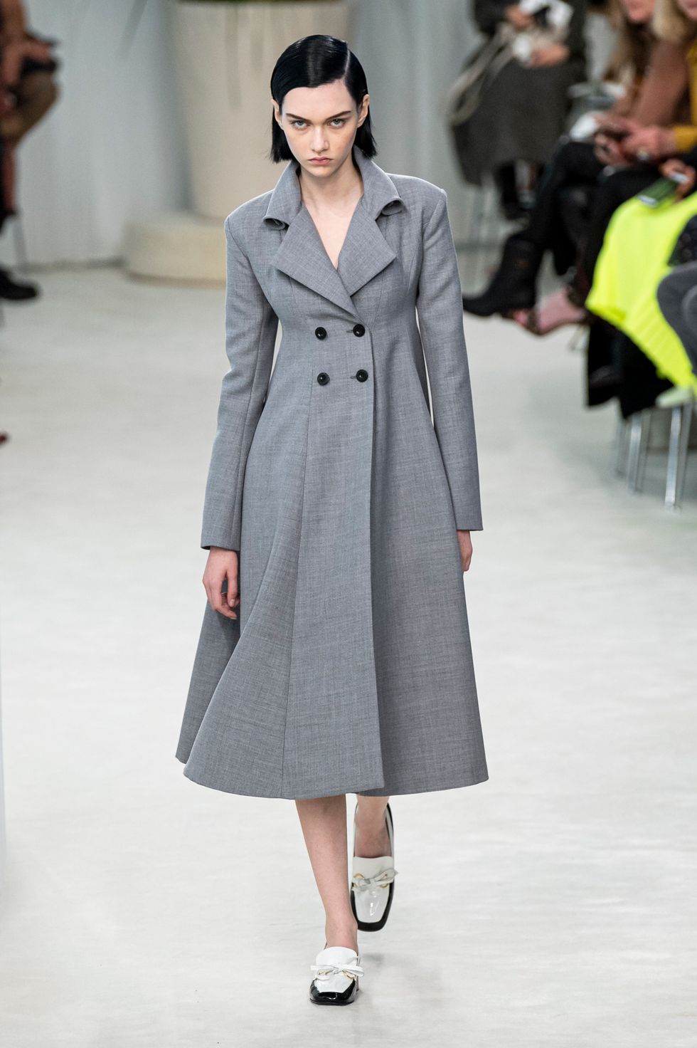 The outerwear consisted of streamlined double-breasted coats and single-breasted car coats in two-tone color blocking, high-low tails, and fitted waists.
