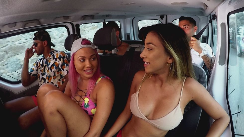 Still, the girls are touched by the gesture, as Lindsay watches from afar. She's wearing a bold lip today. Kyle goes off to stare at the ocean. After a day of drinking, everyone piles into the car to head back to the villa — but as the vehicle pulls up we see Kyle exit in anger, ready to start a fight. Physical fighting on this show! They love it. He punches Brent, who is trying to calmly walk away. A camera guy is forced to step in and separate them.