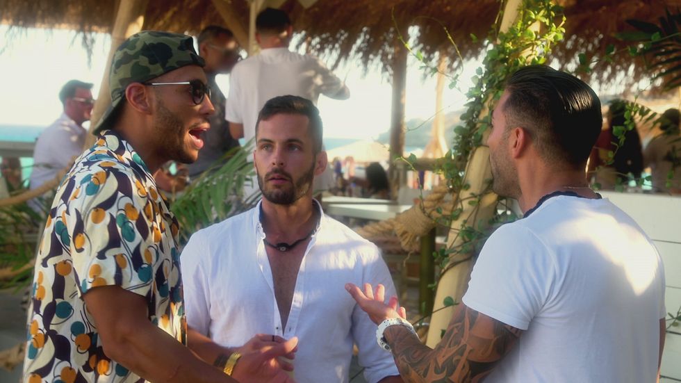 At the morning meeting with Panos, Mike's fellow hosts try and defend their friend. They argue, correctly, that Panos and Lindsay asked Mike to take care of the clients in whatever way he could — and frankly, those Geordie Shore people were more than happy for him to strip down and get sexual. Historically, hooking up with Beach Club clients has always been given the okay by Panos and Lindsay. They've encouraged it! From the male hosts in particular.