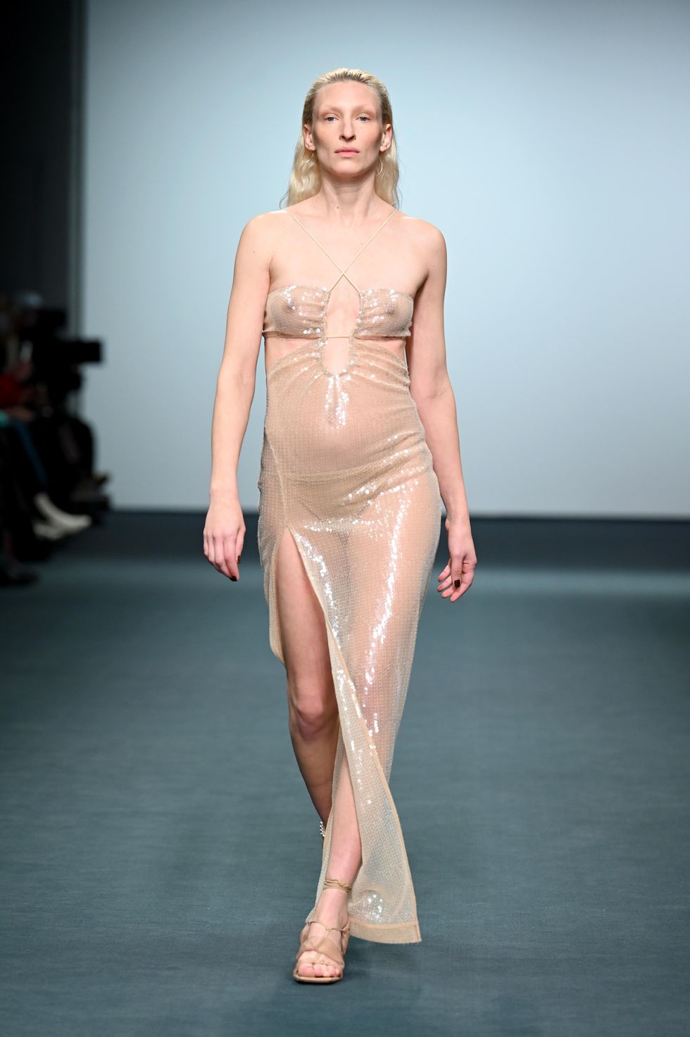 Maggie Maurer, the striking platinum blonde beauty and muse to designers like Peter Do and Daniel Roseberry of Schiaparelli, walked LVMH Prize Winner Nensi Dojakas' runway show revealing her pregnant belly for the first time while wearing a sheer sequin strappy dress.