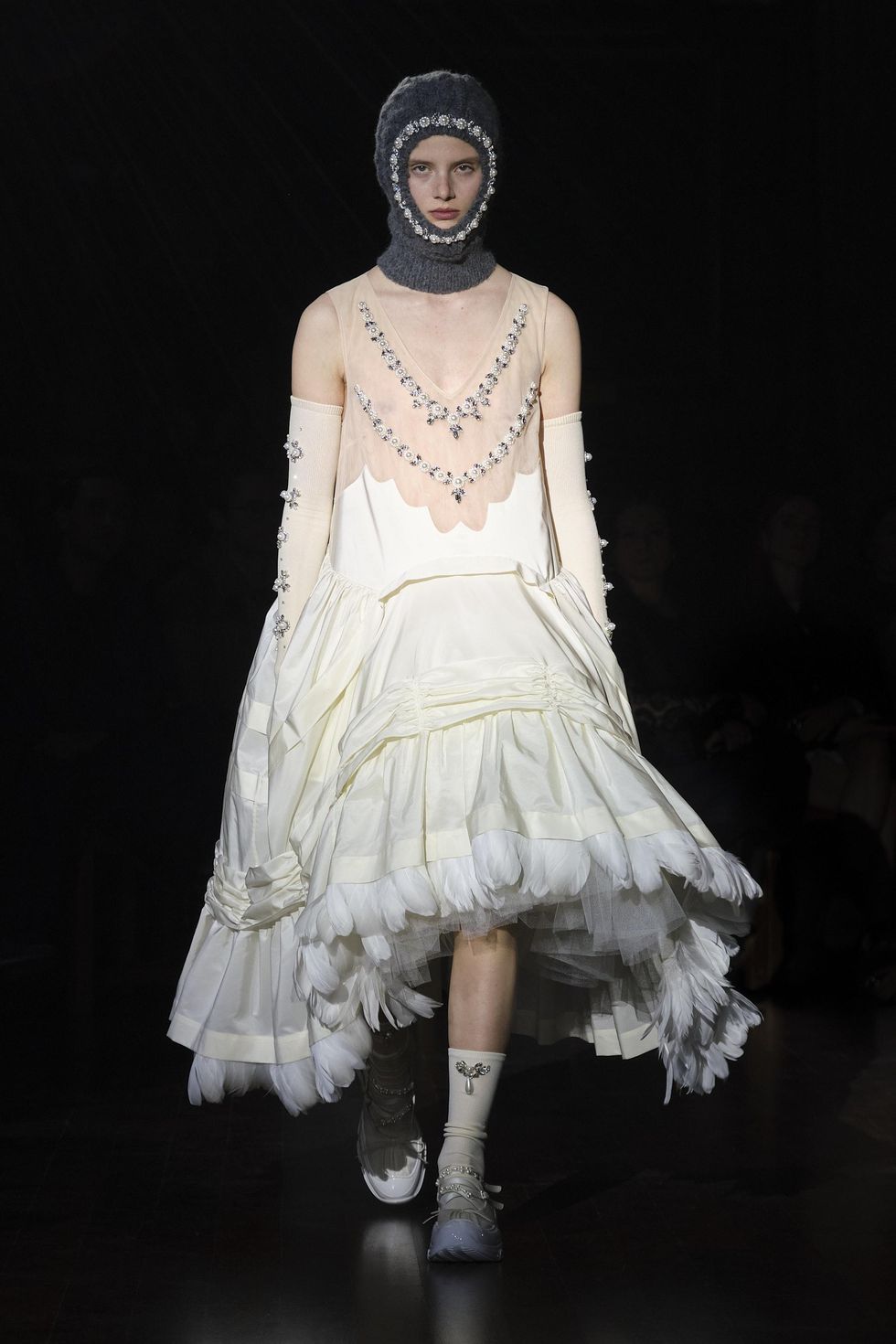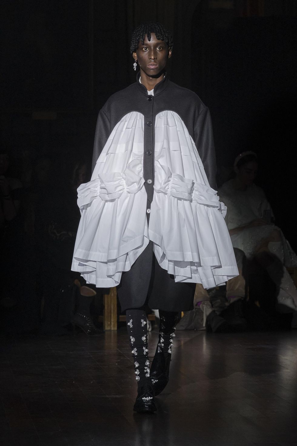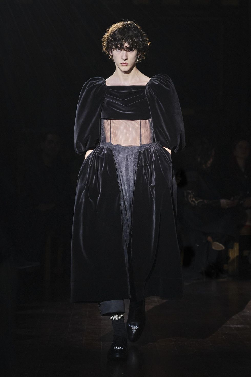 Simone Rocha's new collection played with many of her familiar tropes — big sleeves, exaggerated ruffles and pearl embellishments — but for Fall she introduced boy models for the first time, each of whom wore not masculine-leaning pieces but her usual signatures like opera gloves, tiered skirts and layers of tulle.