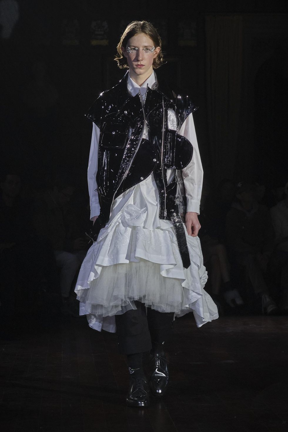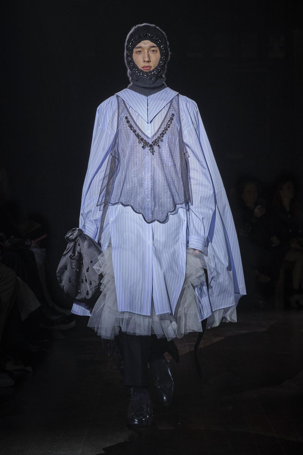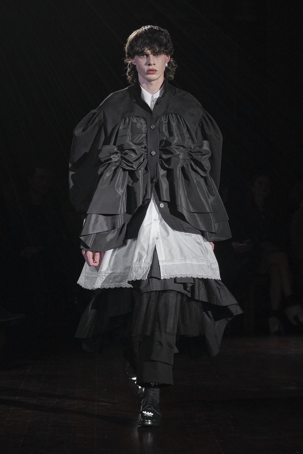 Simone Rocha's new collection played with many of her familiar tropes — big sleeves, exaggerated ruffles and pearl embellishments — but for Fall she introduced boy models for the first time, each of whom wore not masculine-leaning pieces but her usual signatures like opera gloves, tiered skirts and layers of tulle.