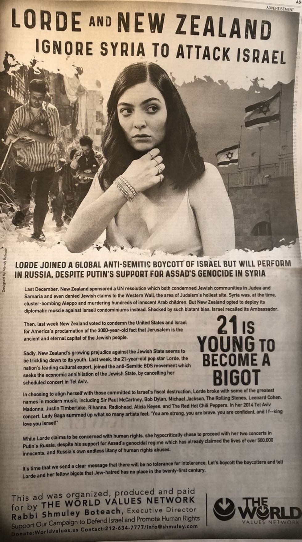 Lorde's decision to cancel her Israel concert in December was met with accusations of bigotry, namely by the Trump-supporting Breitbart bro and Rabbi Shmuley Boteach, an actual bigot who castigated Lorde for promoting "a global antisemitic boycott of Israel" in a full-page Washington Post advert.