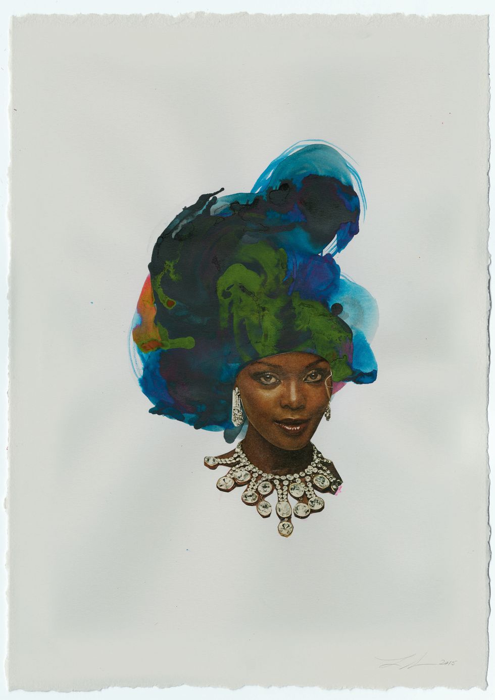 The images are colorful and wondrous. The women and men in the collage are adorned in diamonds and pearls, and their hair is comprised of things like gold or bold blue and orange brush strokes. Excerpts of text that say things like "Wall Street Stockbroker Trainee" and "Numbers Boss Defies Death To Go Straight" are also included in the collages.