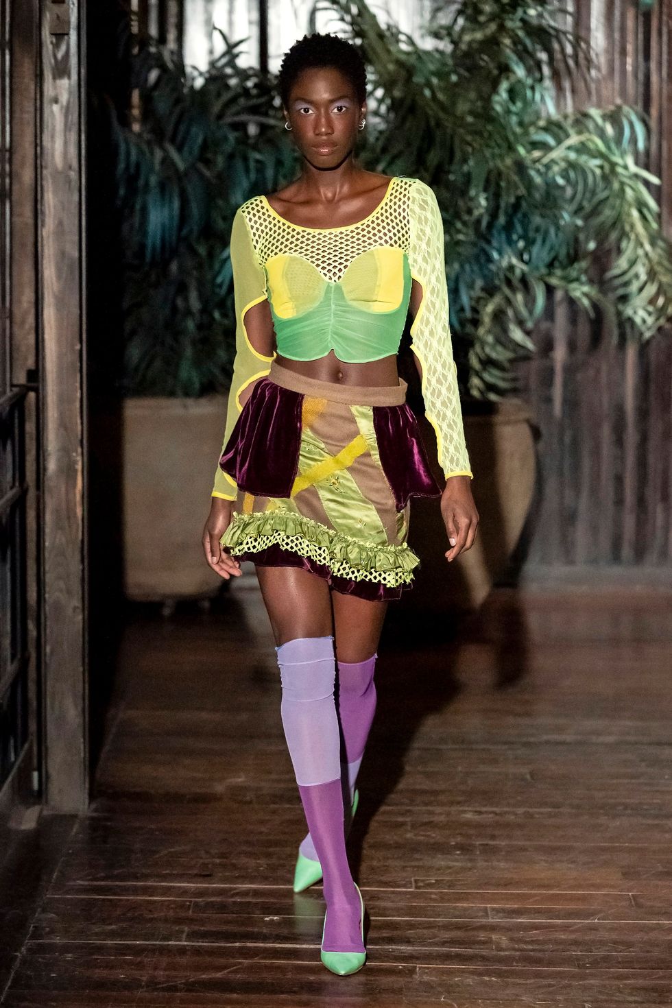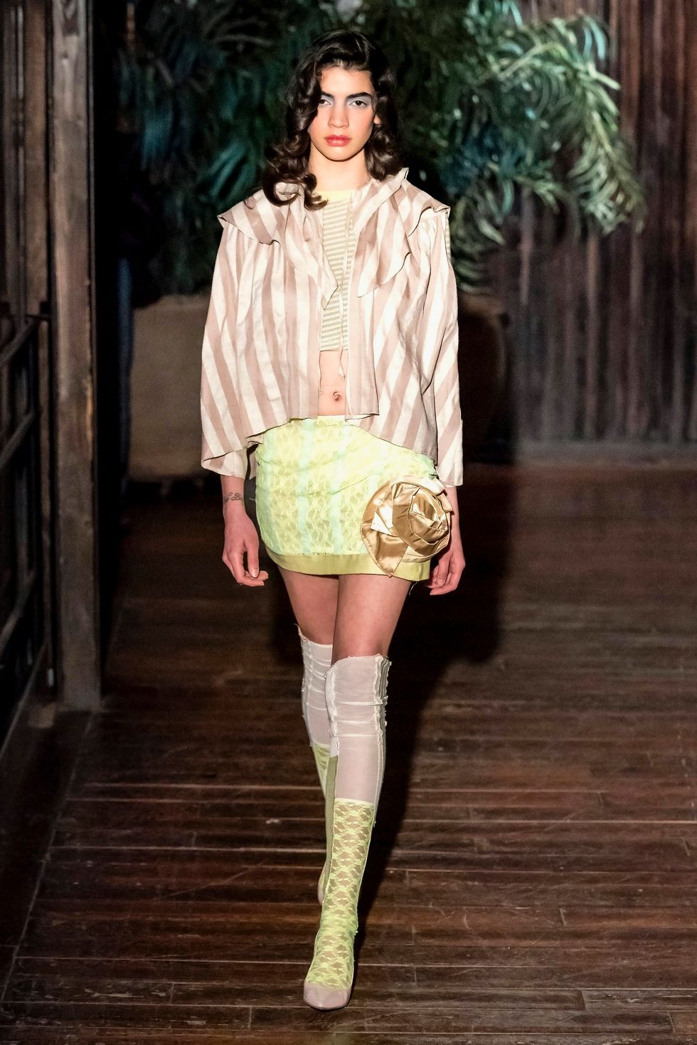 But my favorite looks were the art school girls, in mini skirts and thigh high stockings. One look pushed the concept far; the model wore a cable-knit lime green cropped cardigan and skirt set with turquoise trim. Very Cher Horowitz if she was into e-flux. It ruled!