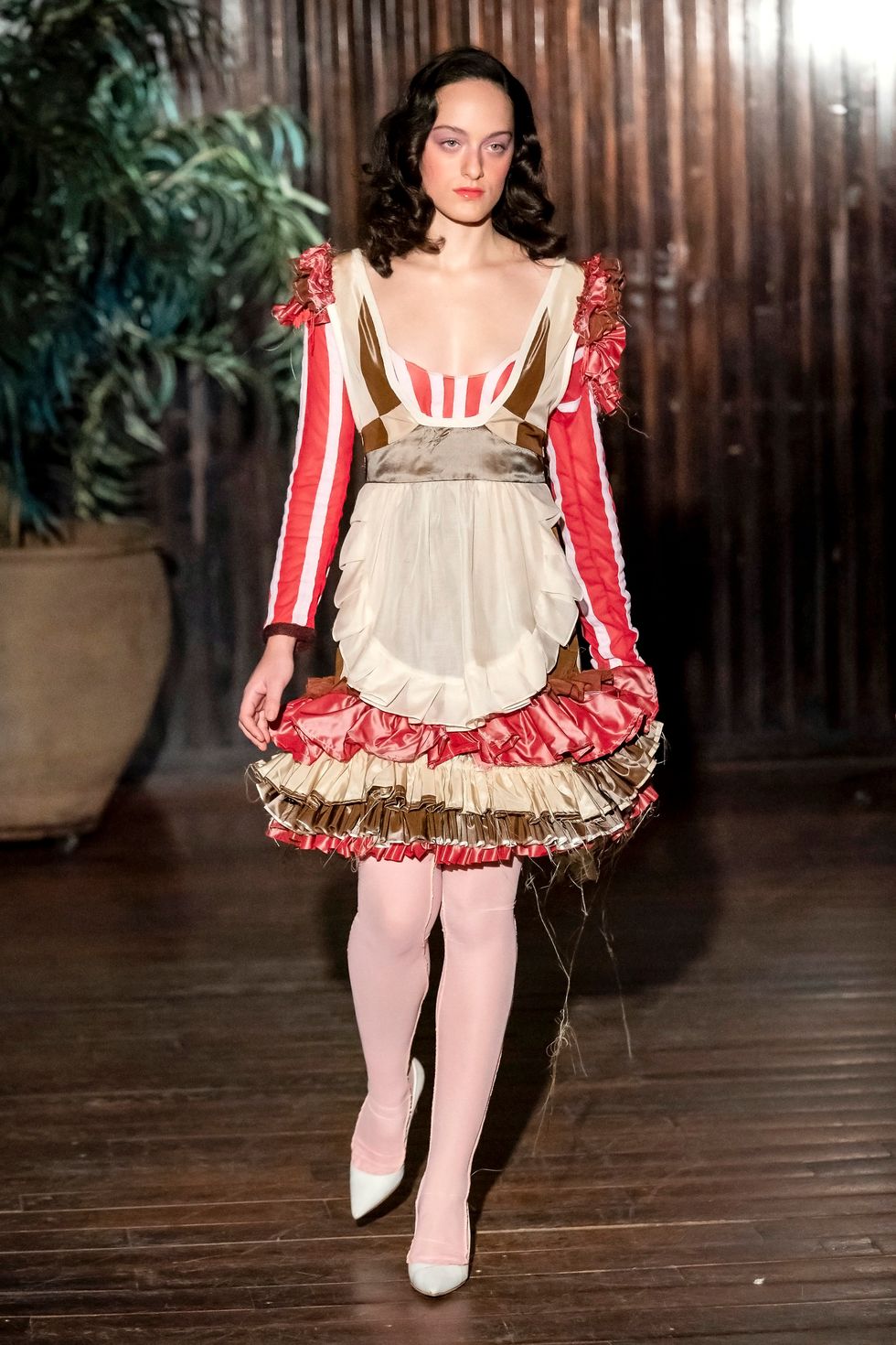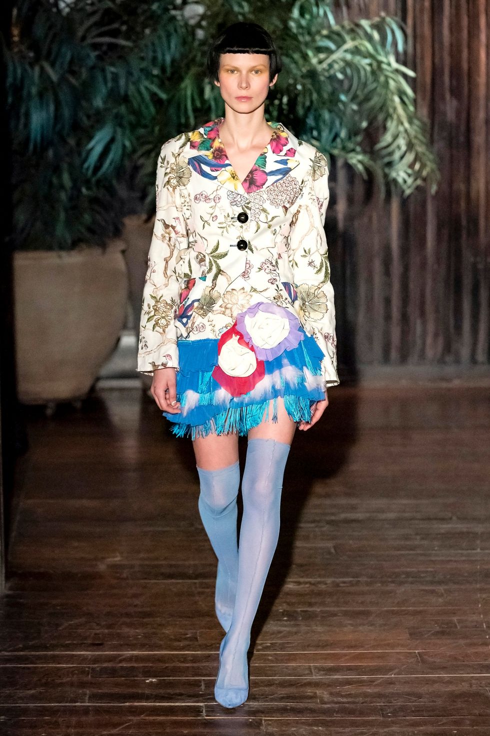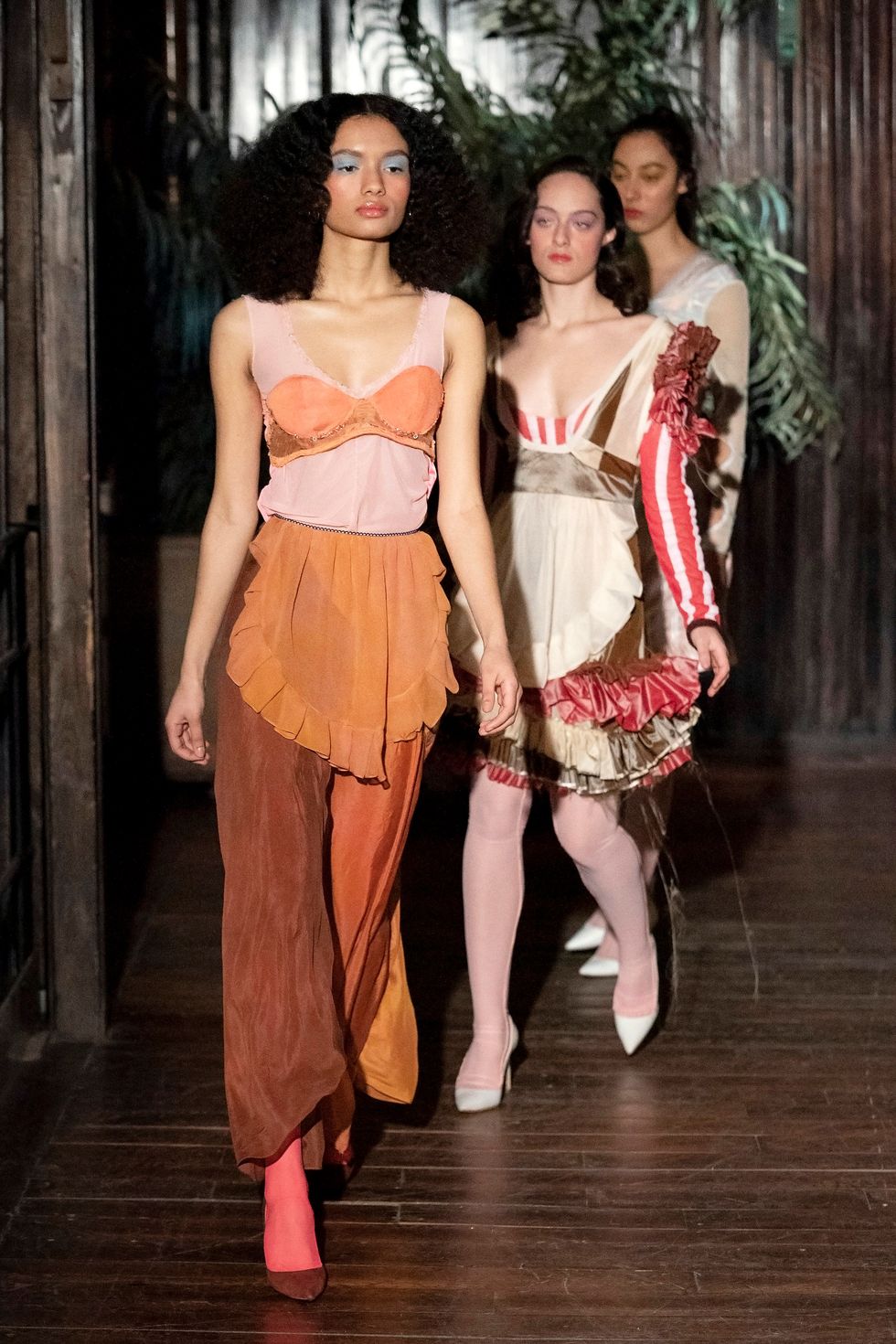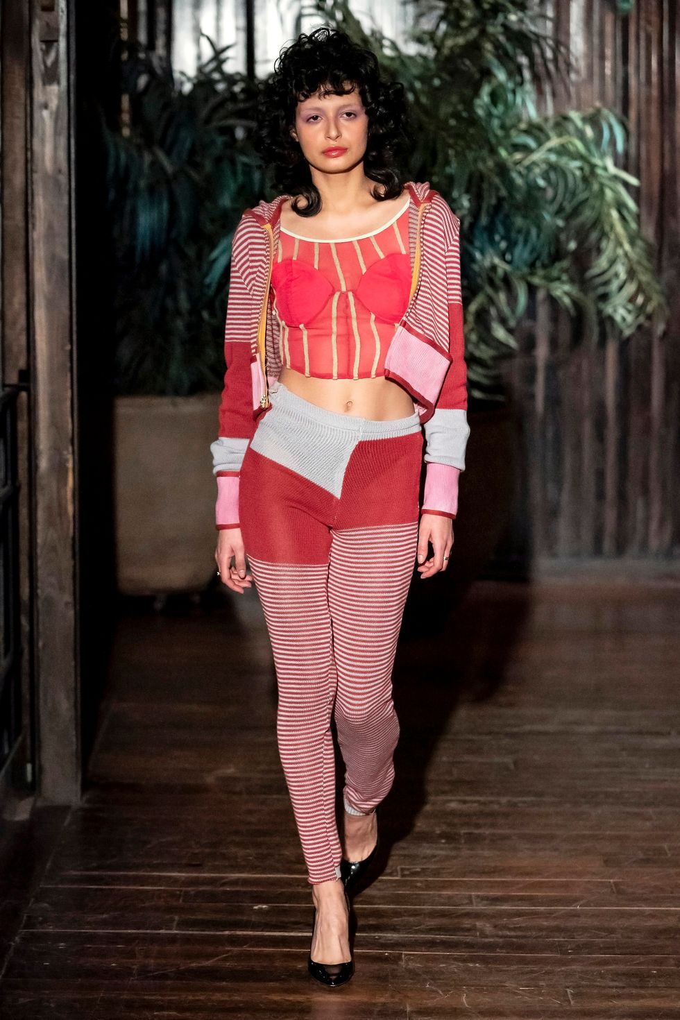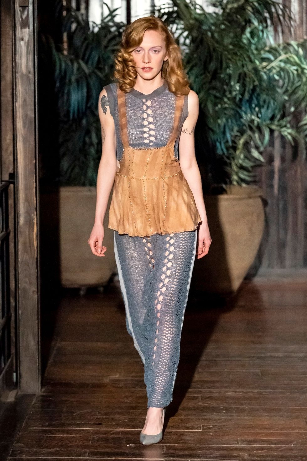Lou Dallas tends to take a medieval bent, with styling cues taken from somewhere around the late 15th century — she loves corsetry and brocade. I love her work, and this season it seemed more polished, saleable. I loved the puffs of fur on cigarette pants and a patch-worked jacket with a scalloped neckline, the long knit dresses, a floral robe paired with Creamsicle-colored trousers.
