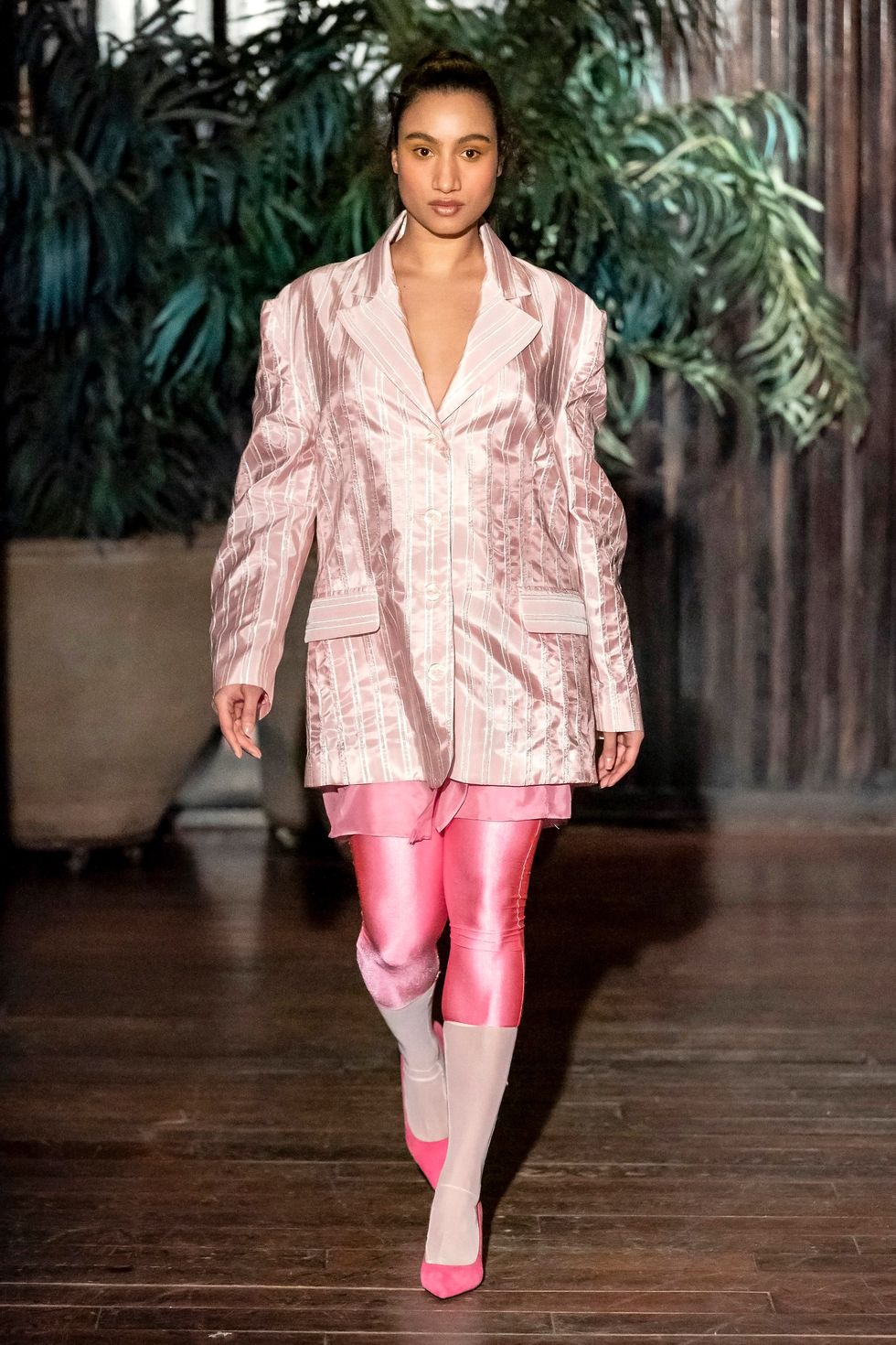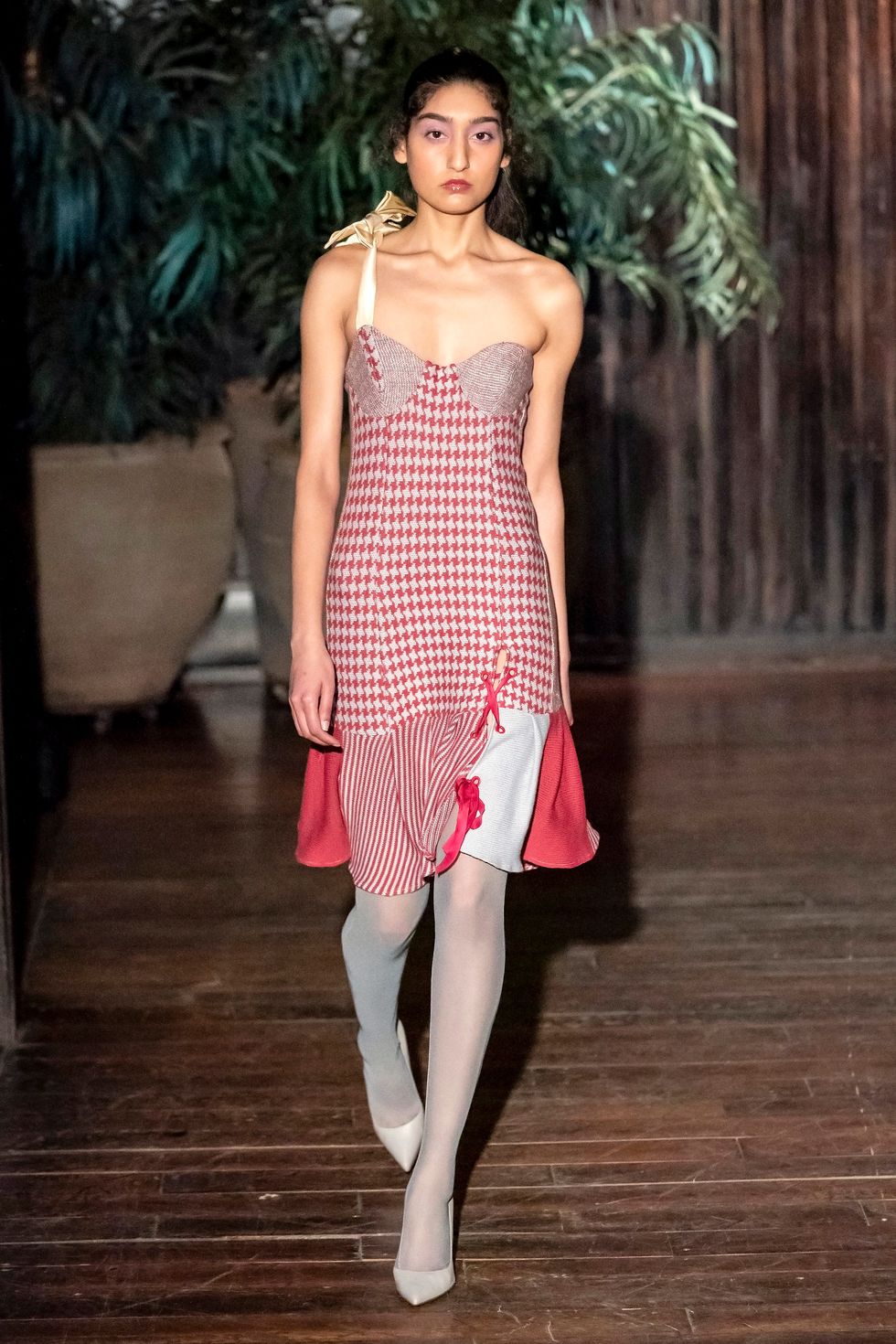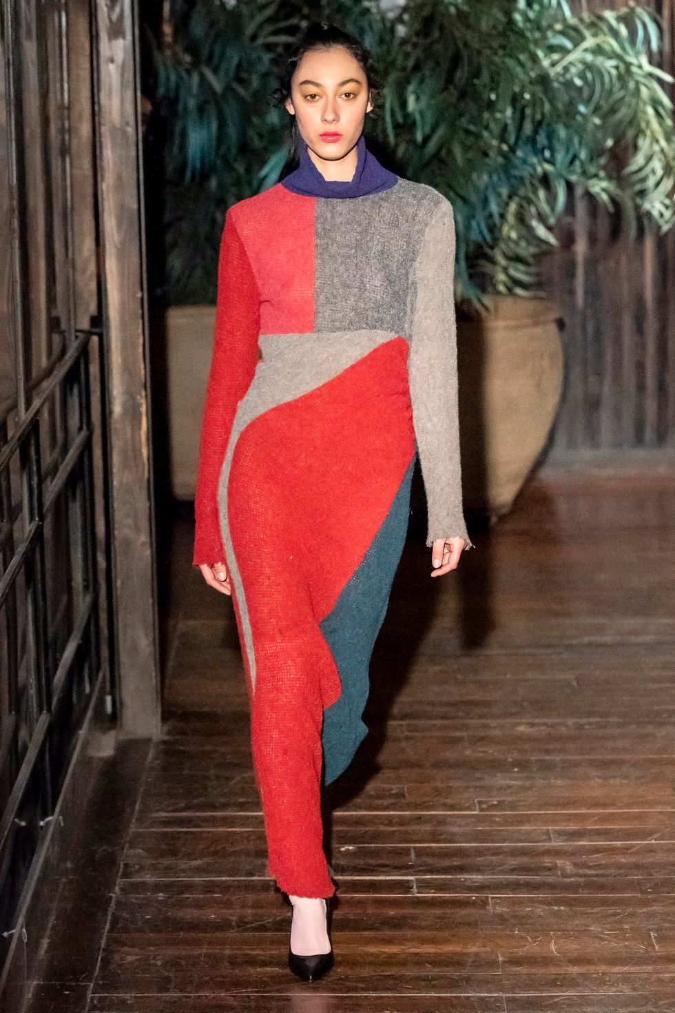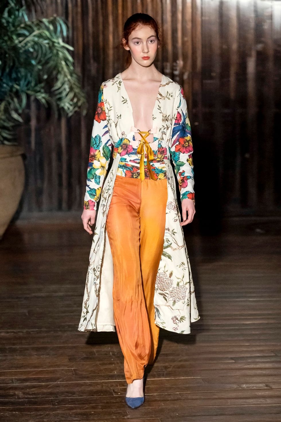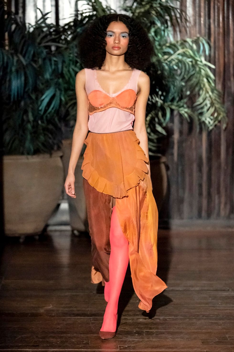 Lou Dallas tends to take a medieval bent, with styling cues taken from somewhere around the late 15th century — she loves corsetry and brocade. I love her work, and this season it seemed more polished, saleable. I loved the puffs of fur on cigarette pants and a patch-worked jacket with a scalloped neckline, the long knit dresses, a floral robe paired with Creamsicle-colored trousers.