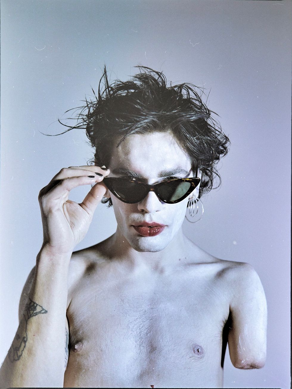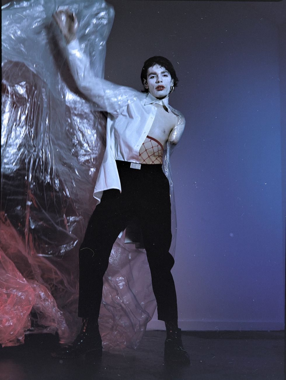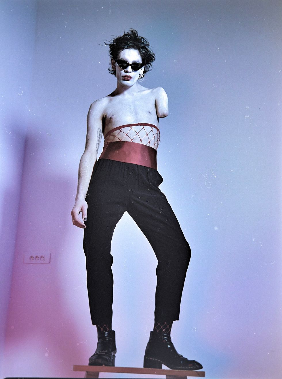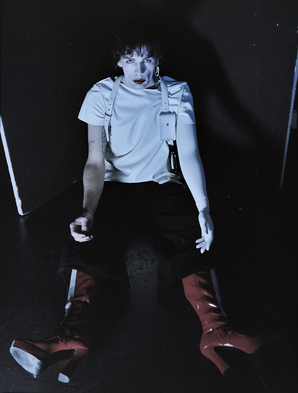 Looking at the lookbook images, it's easy to see how he designs for worlds both bizarre and real. A jacket with a a wide lapel recalls historical men's tailoring, but detachable sleeves can turn into a grungy waistcoat, or launch in firmly into avant-garde with one sleeve removed (beautifully modeled by disabled model Luc Bruyere) — all while showing off a bit of naughty underarm. Even the timeless white t-shirt can be cinched up like a straightjacket, a cheeky statement on the more serious consequences of toxic masculinity. It's as though Peter Murphy was cast in an 80s slasher flick, and we can dream.