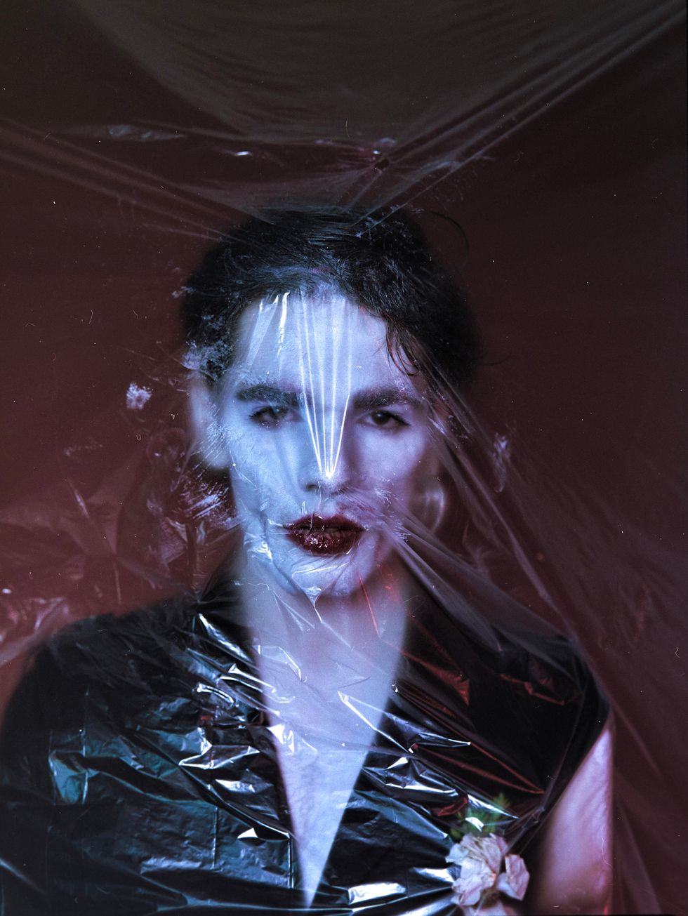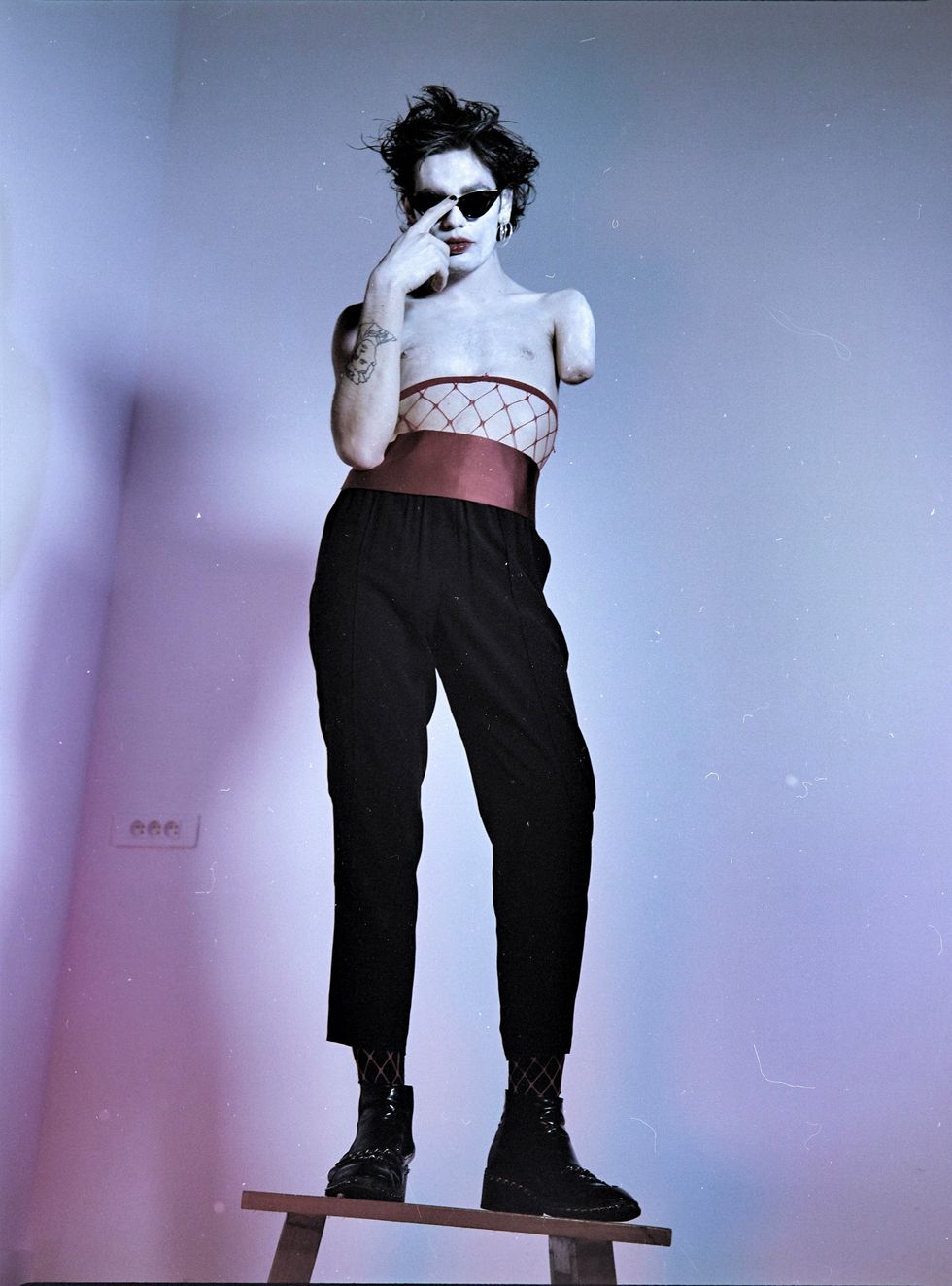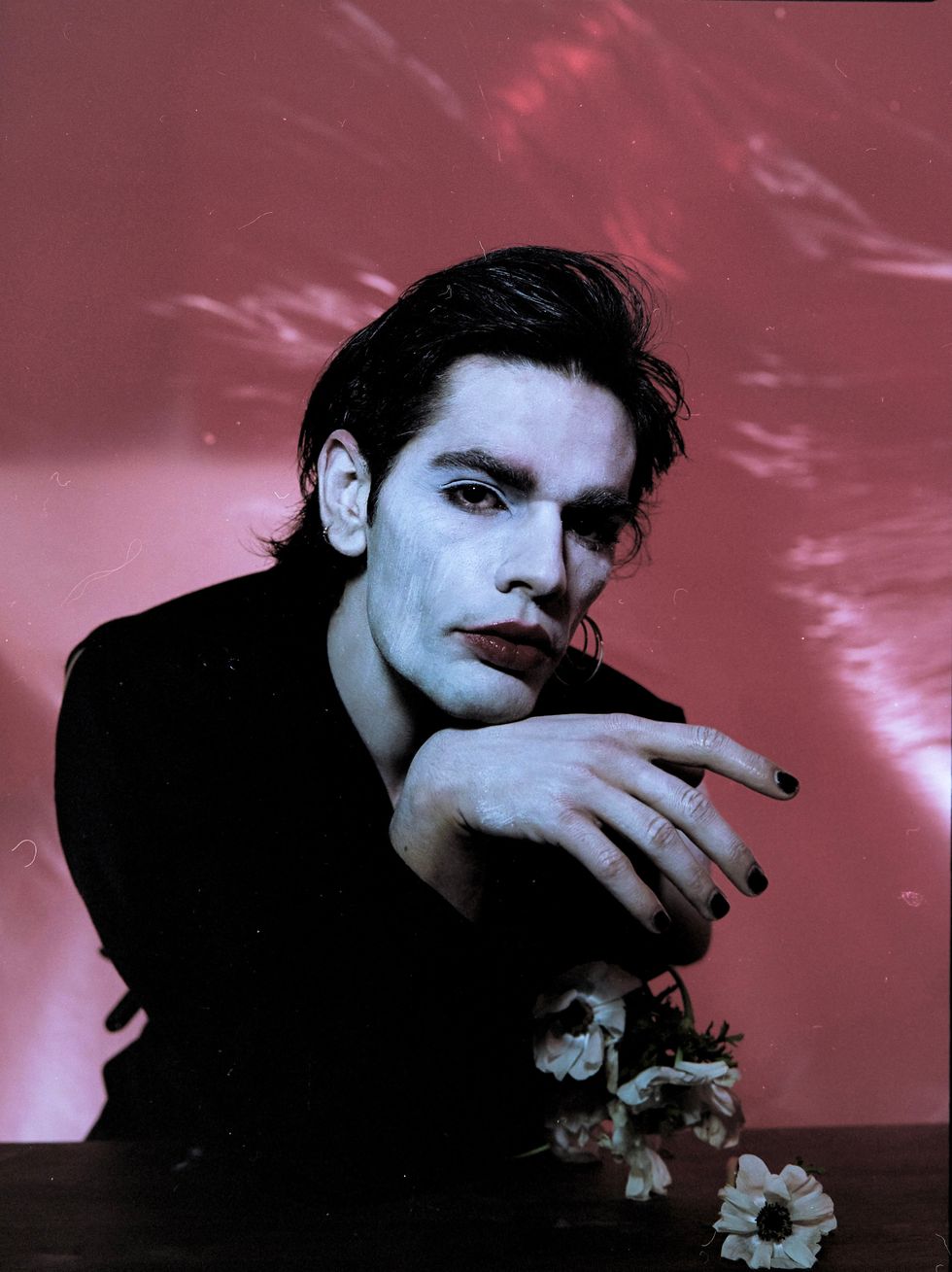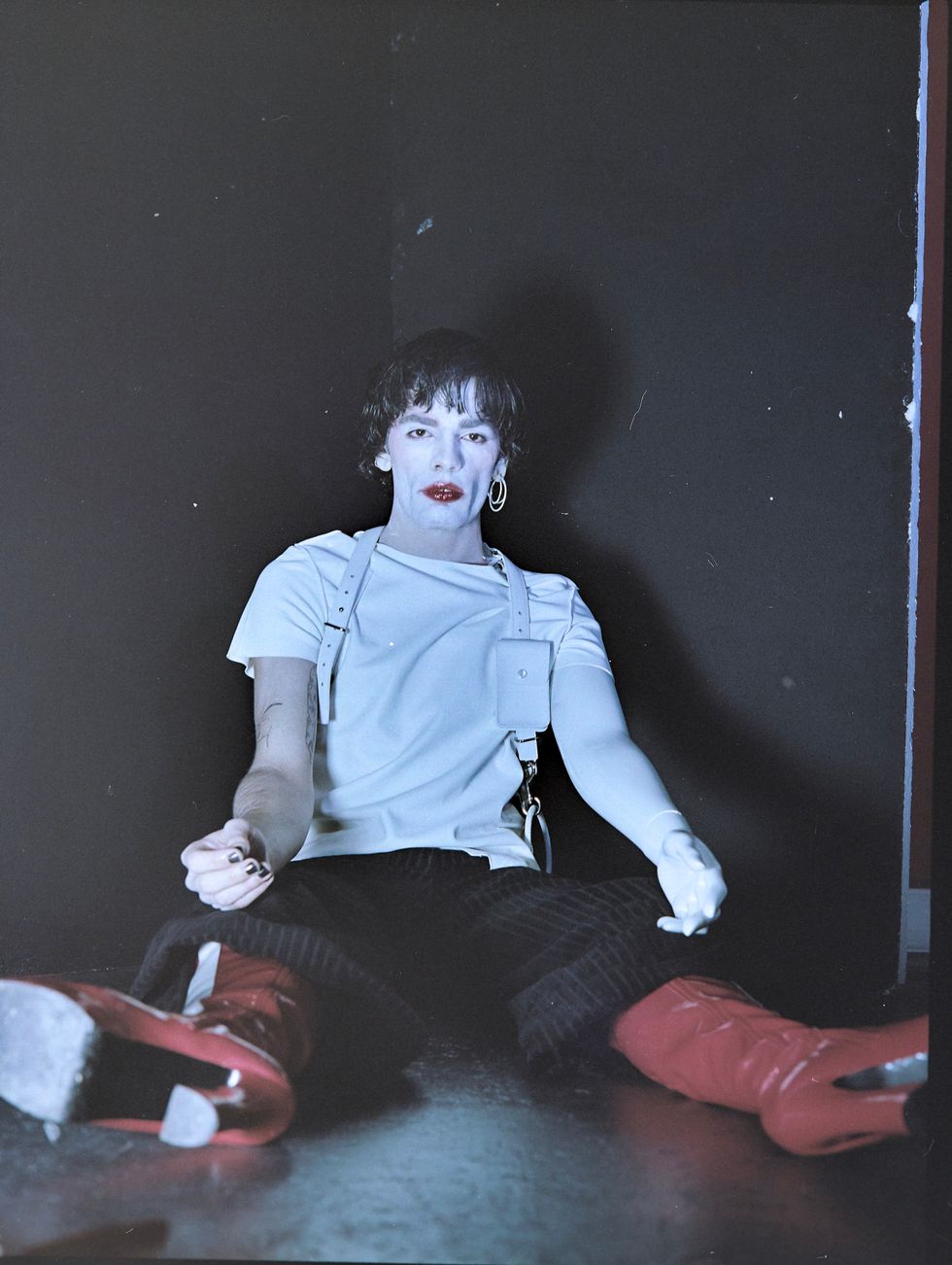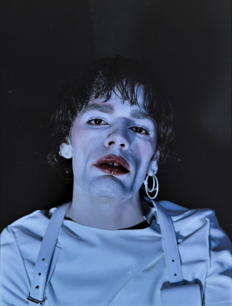 Looking at the lookbook images, it's easy to see how he designs for worlds both bizarre and real. A jacket with a a wide lapel recalls historical men's tailoring, but detachable sleeves can turn into a grungy waistcoat, or launch in firmly into avant-garde with one sleeve removed (beautifully modeled by disabled model Luc Bruyere) — all while showing off a bit of naughty underarm. Even the timeless white t-shirt can be cinched up like a straightjacket, a cheeky statement on the more serious consequences of toxic masculinity. It's as though Peter Murphy was cast in an 80s slasher flick, and we can dream.