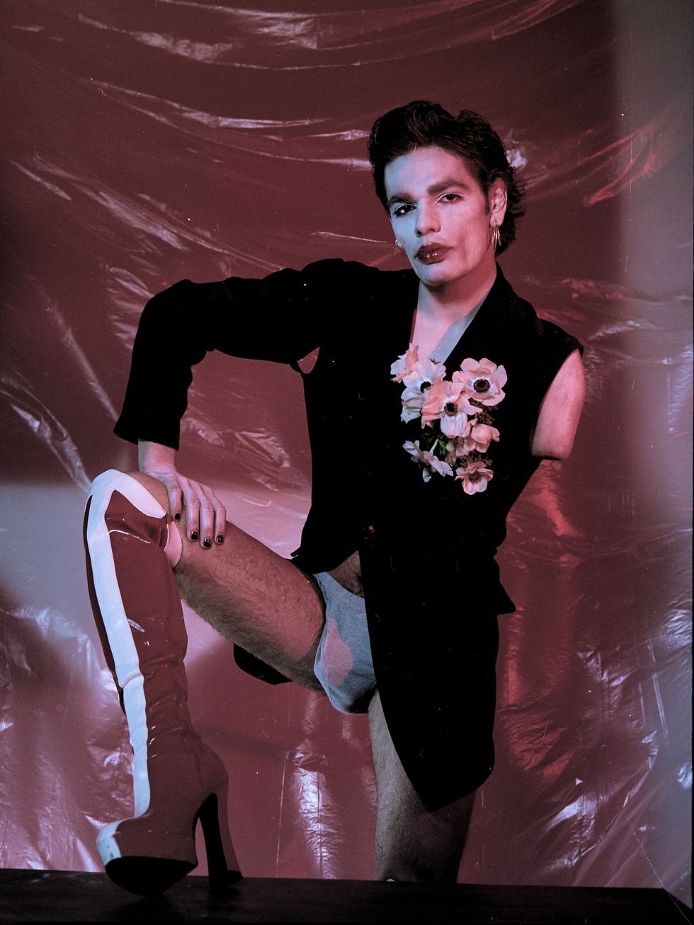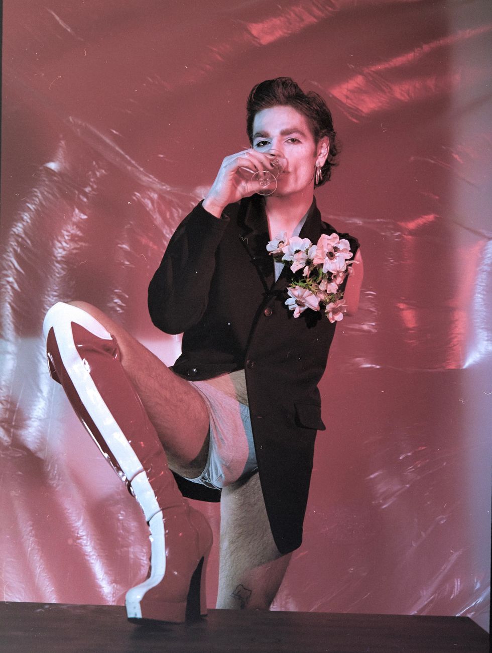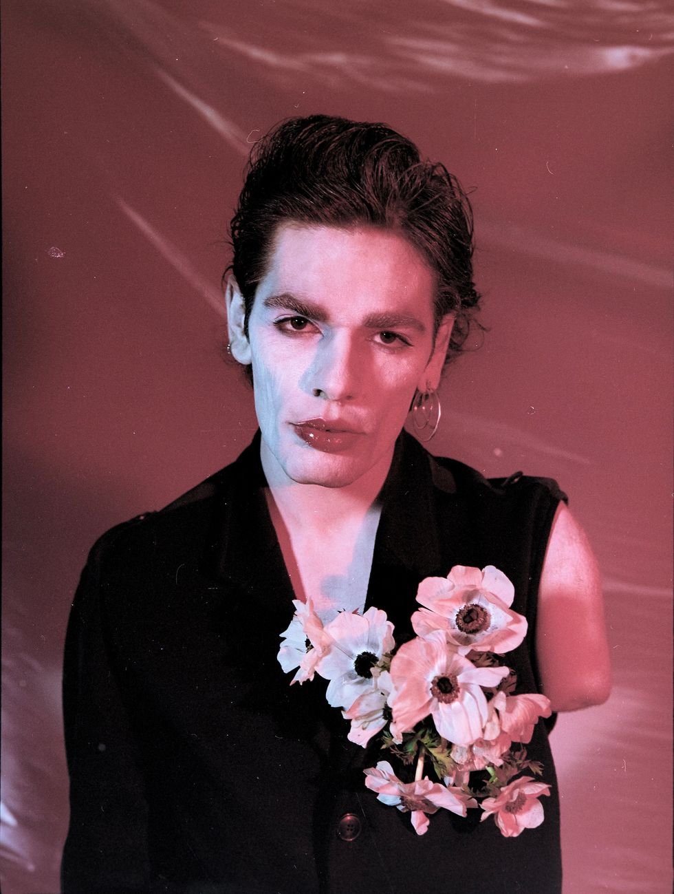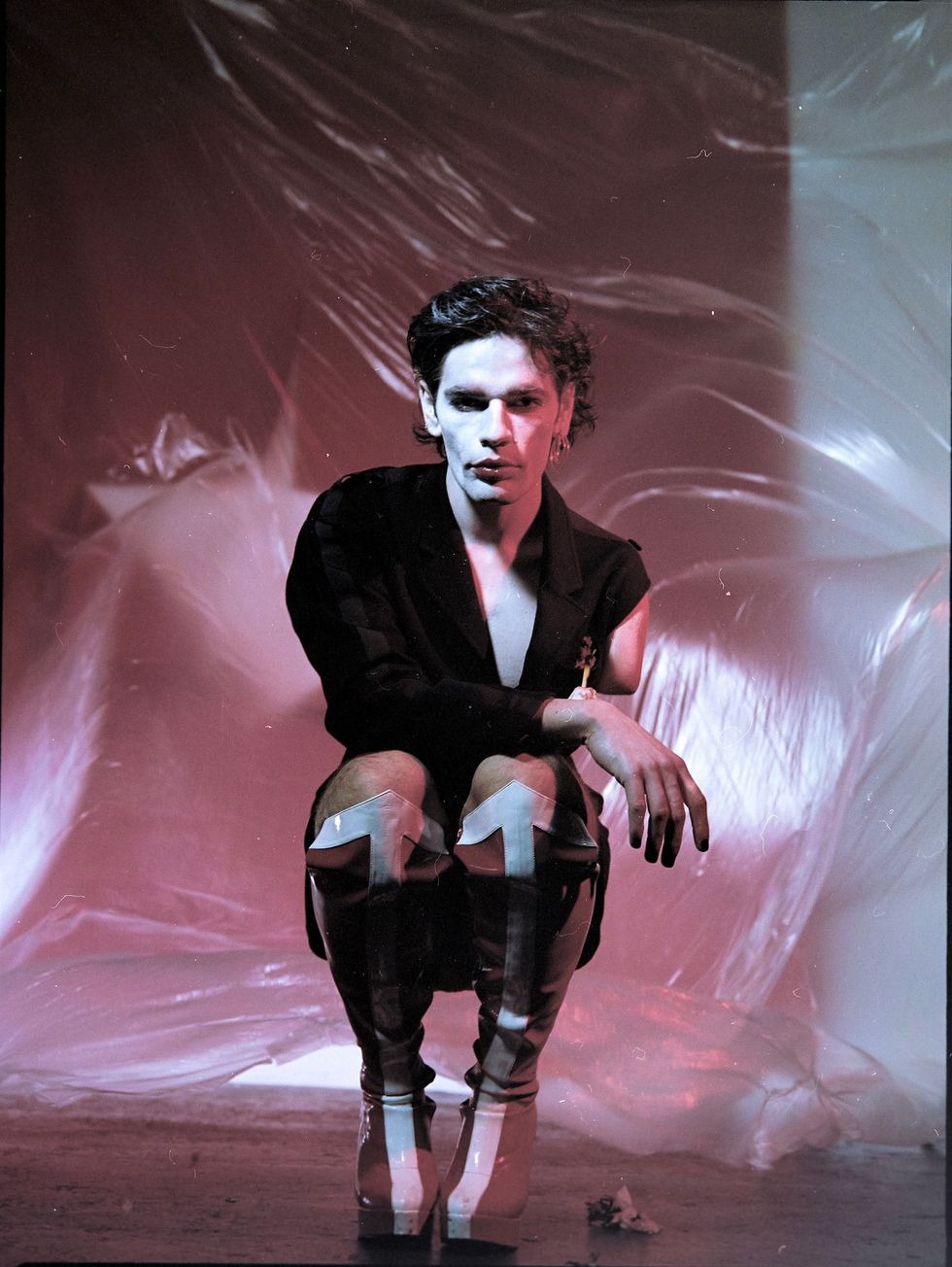 Looking at the lookbook images, it's easy to see how he designs for worlds both bizarre and real. A jacket with a a wide lapel recalls historical men's tailoring, but detachable sleeves can turn into a grungy waistcoat, or launch in firmly into avant-garde with one sleeve removed (beautifully modeled by disabled model Luc Bruyere) — all while showing off a bit of naughty underarm. Even the timeless white t-shirt can be cinched up like a straightjacket, a cheeky statement on the more serious consequences of toxic masculinity. It's as though Peter Murphy was cast in an 80s slasher flick, and we can dream.
