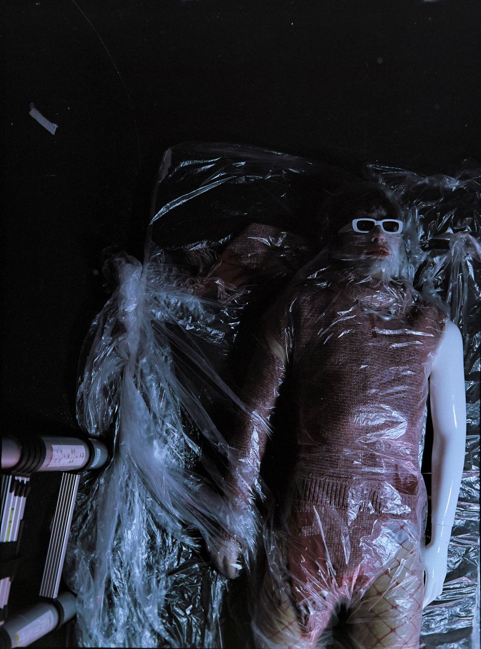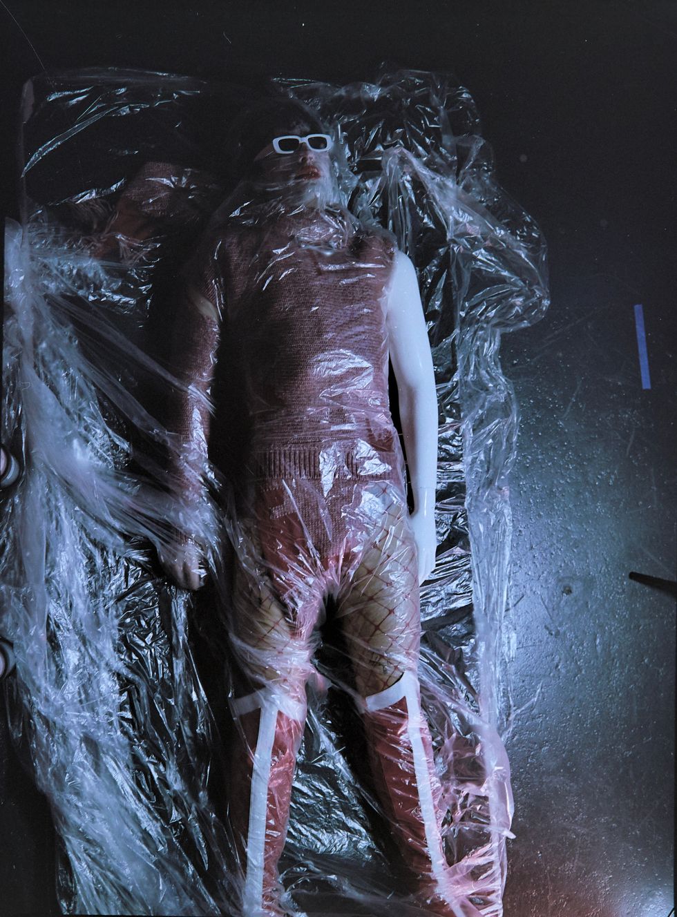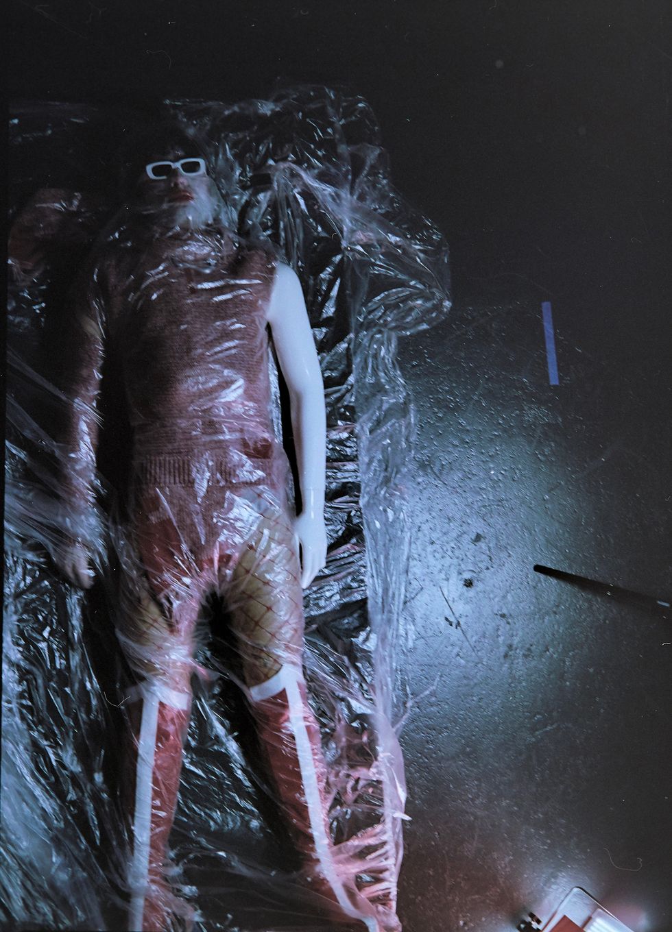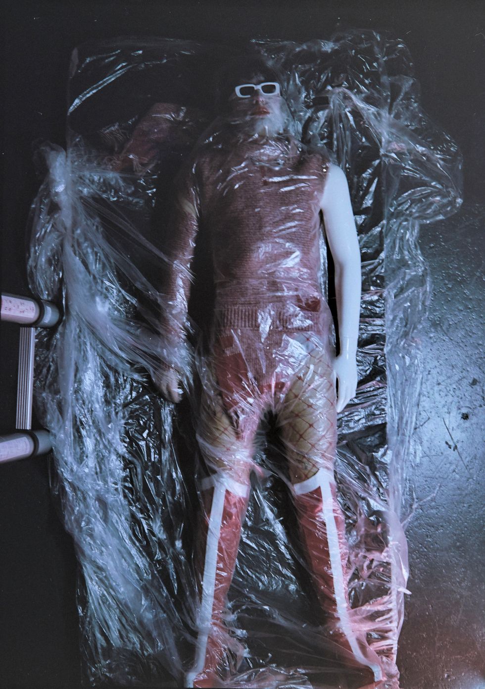 But amidst Nouchi's horror fantasy, there is very real knitwear. A preppy sweater silhouette is subject to the jacket's deconstruction, its sleeves becoming scarves. Nouchi is keen to expand his business with knits and jersey garments, explaining that he's "working hard with [the] factories to develop new things, [like] fabrics and yarns." He understands that scaling his two-person business is a slow, deliberate process. "It takes time to develop those things, and I want to do it step by step," he says.