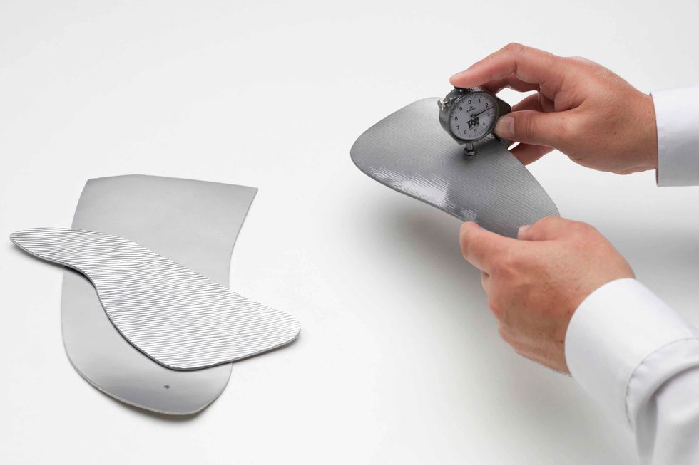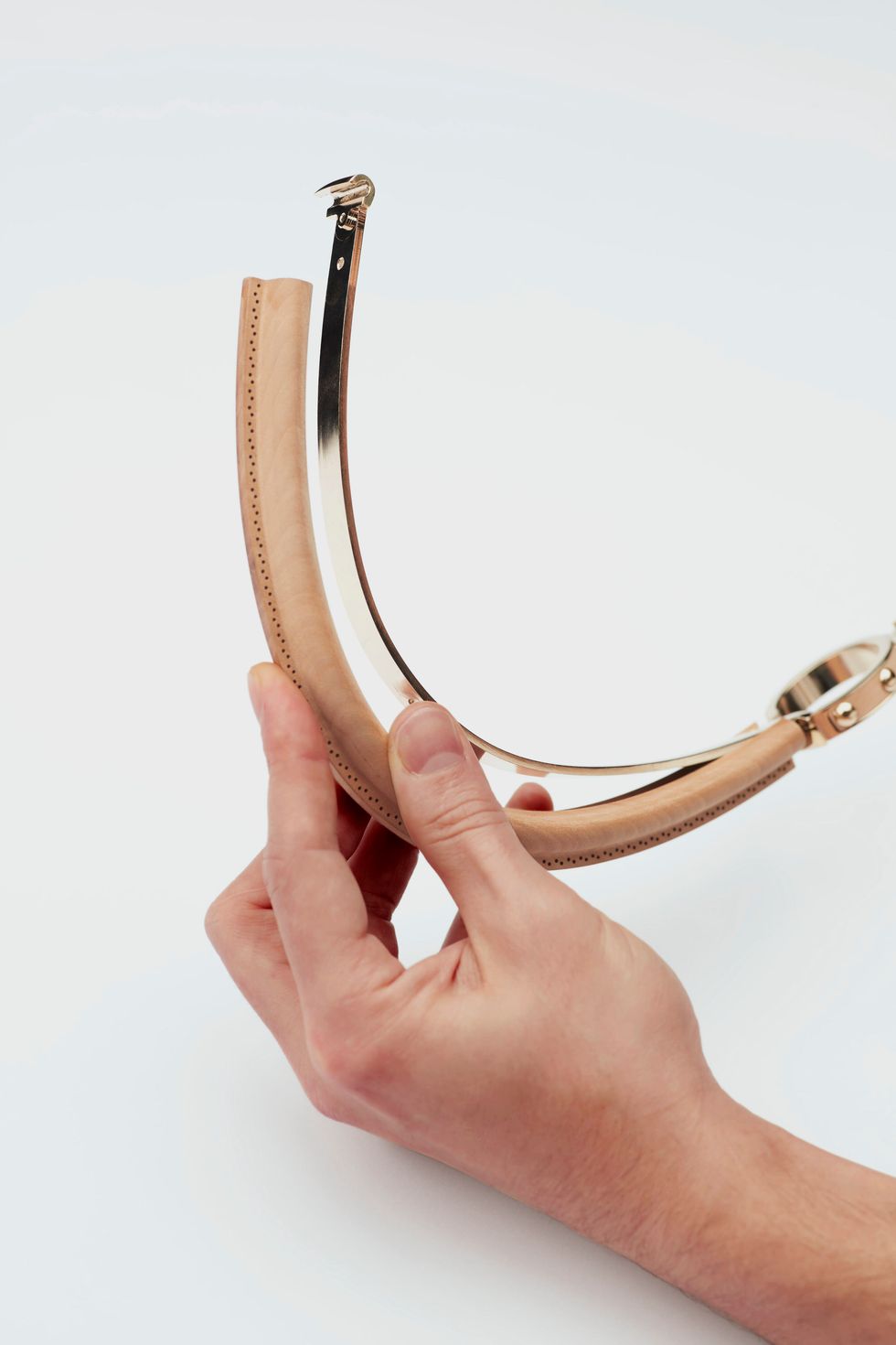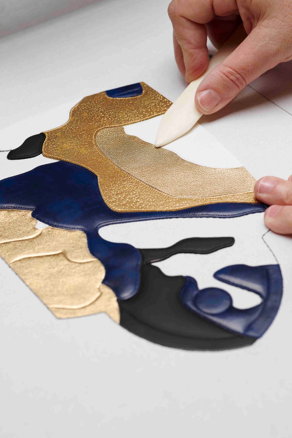 Chinese artist Zhao Zhao's 2018 sculpture "In Extremis No.3" inspired his Capucine, transforming the work's metal components into laser-cut leather patches that are sewn together into a single panel following the layout of Zhao's original piece, covering the bag's surface with the final pattern.