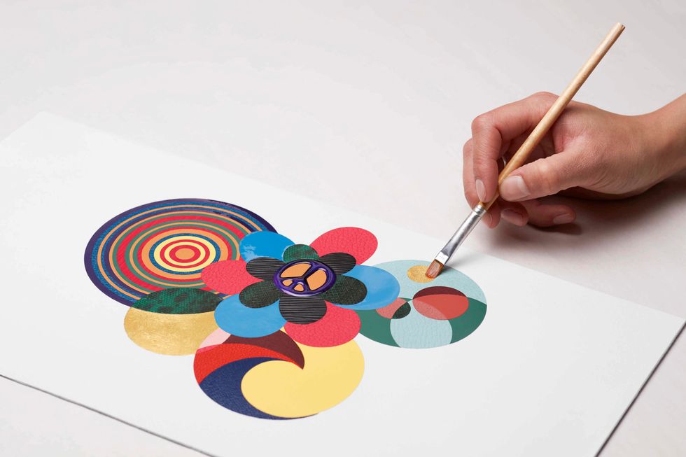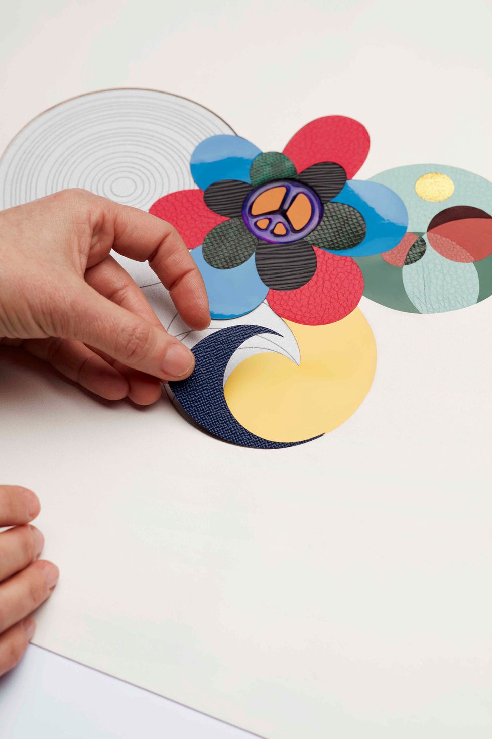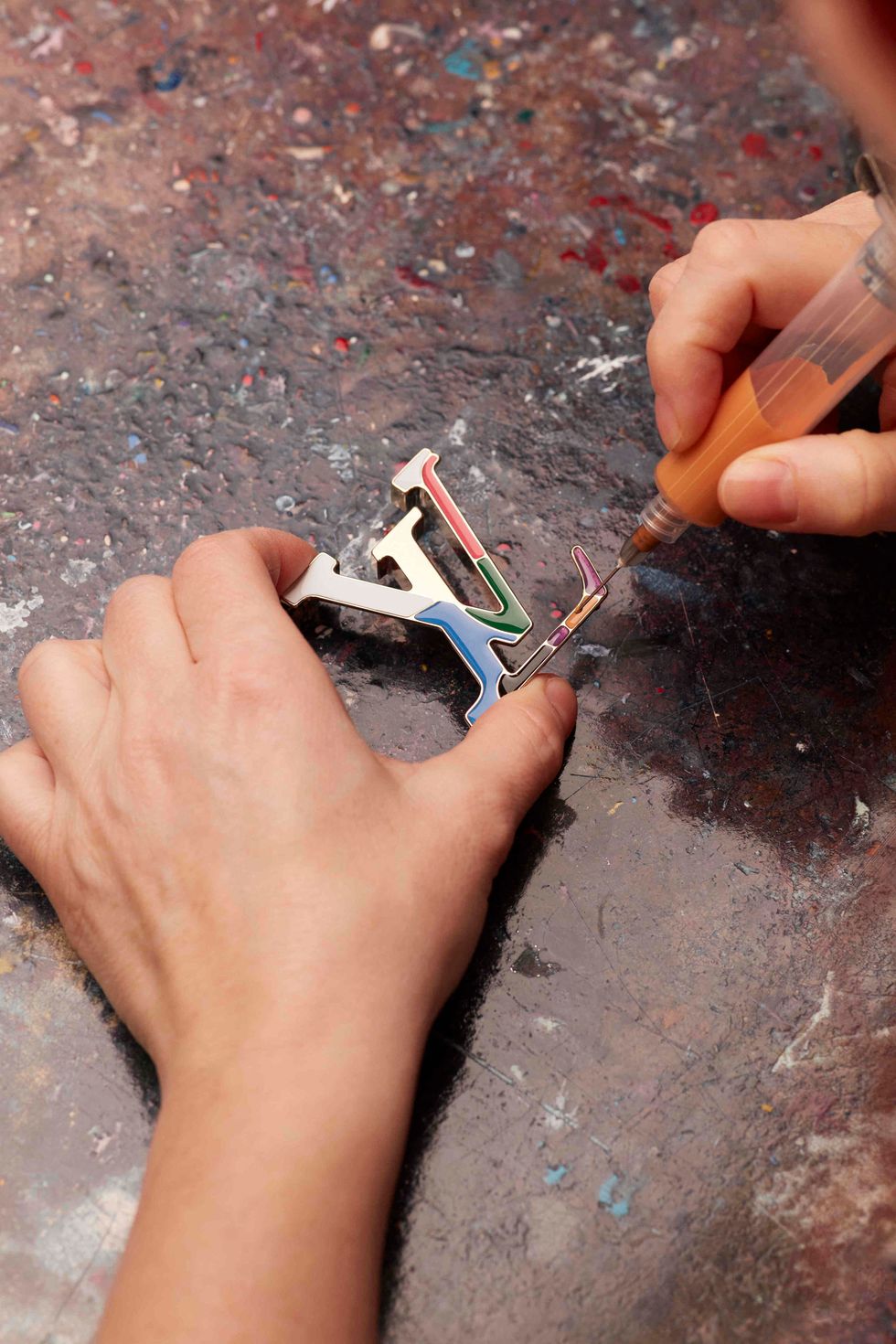 Brazilian artist Beatriz Milhazes used 18 different types of leather made into the same thickness and then inlaid onto the bag's lambskin case using marquetry techniques. Among the kaleidoscopic textures are two areas of golf leaf and a silicone gel peace sign. The LV logo matches the exact colors of the artworks thanks to its enamel maquetry and gel.
