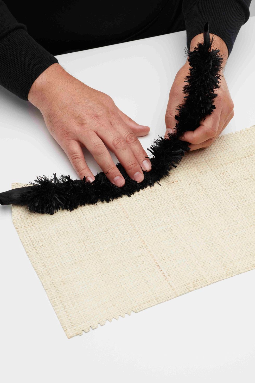 The bag's main body in Jean-Michel Othoniel's version is made of intricately hand-woven raffia, while a hand-embroidered trim along the top edge uses a type of black satin silk commonly used in haute couture. Its handle is made of large black resin beads reminiscent of the French artist's popular large-scale works, and the charm is made of three sculptural resin beads.